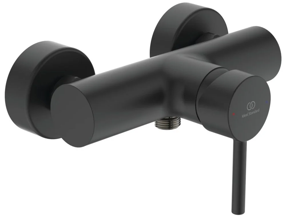 CERALINE Настенный смеситель для душа, картридж 38 мм FirmaFlow с функцией HWTC (ограничение максимальной температуры горячей воды), монтаж на стандартных эксцентриках (в комплекте: эксцентрики, металлические отражатели, уплотнительные прокладки), металлическая рукоятка с индикаторами горячей / холодной воды, обратный клапан