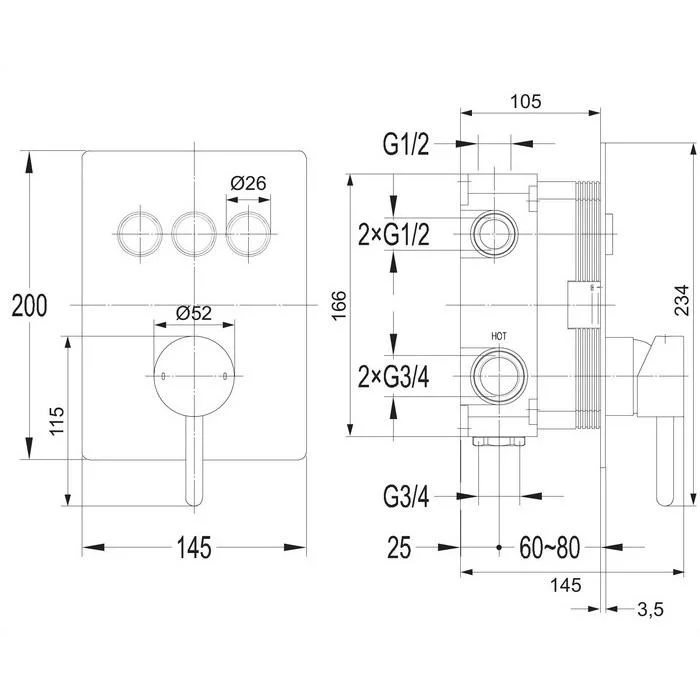 - три выхода смешанной воды: 1/2” (расход: 20 л/мин. на каждом выходе);