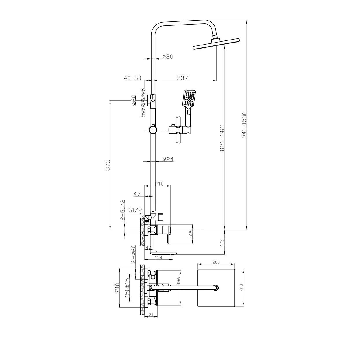 - Верхняя поворотная душевая лейка «Тропический дождь» 200x200 мм