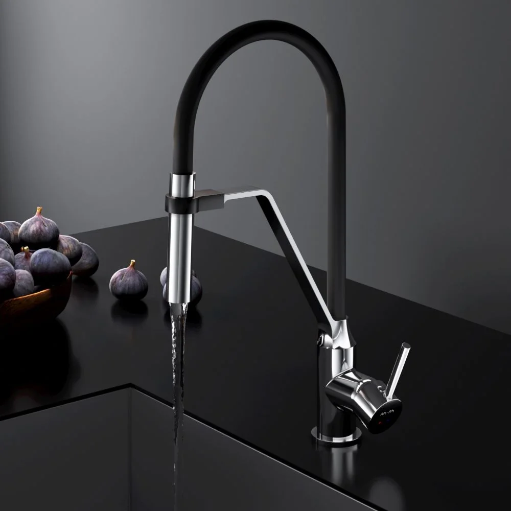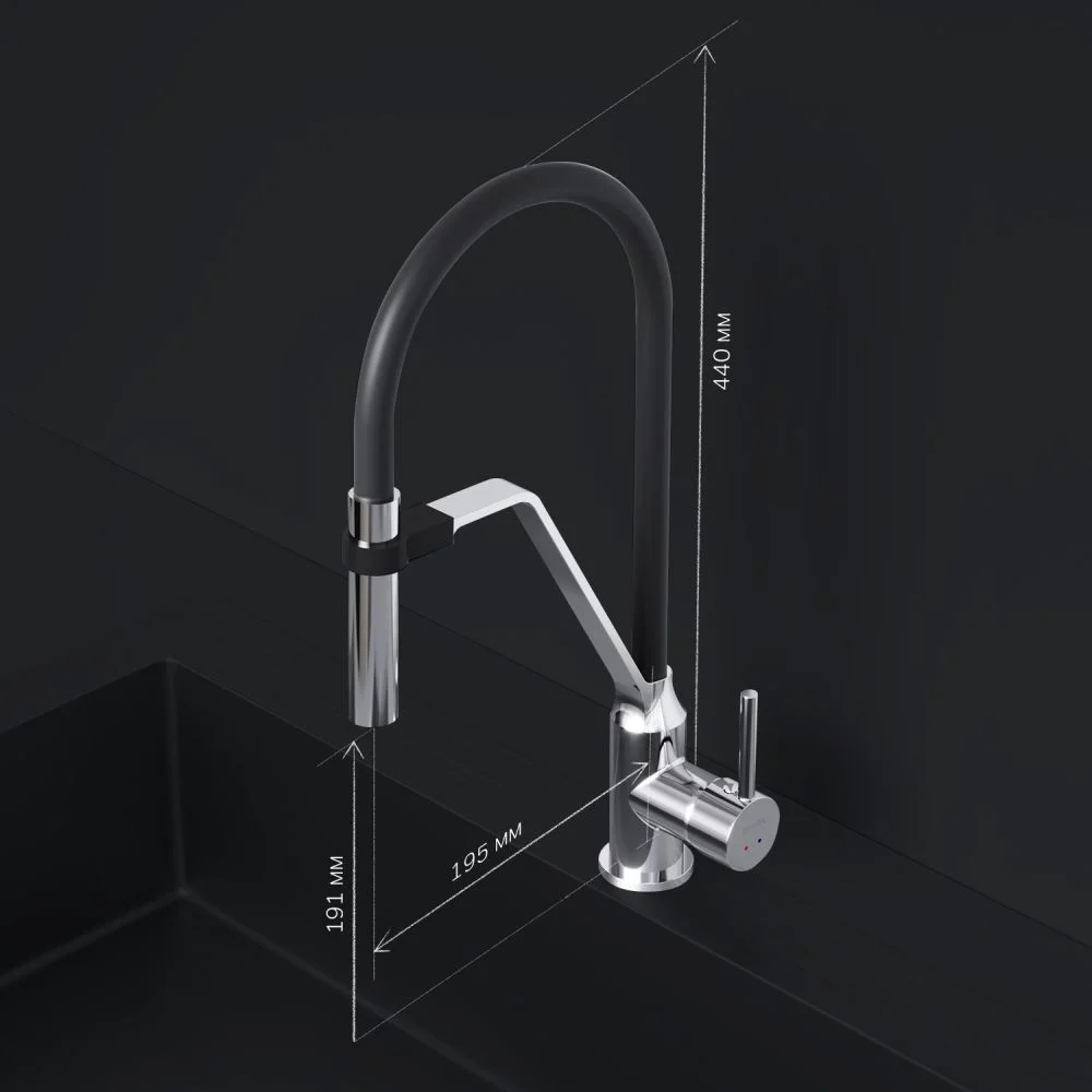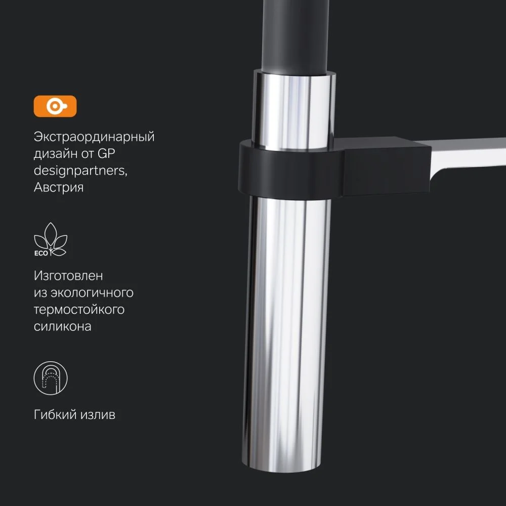 Гибкий излив значительно расширяет зону использования смесителя гарантирует легкий уход за мойкой и наполнение емкостей любой высоты. Излив изготовлен из термостойкого силикона. Силикон абсолютно безопасен при контакте с водой т.к. в составе силикона отсутствуют вредные для здоровья токсичные компоненты. Гладкий силиконовый излив устойчив к загрязнениям - легкий уход. Излив износостойкий и устойчив к перегибам.
