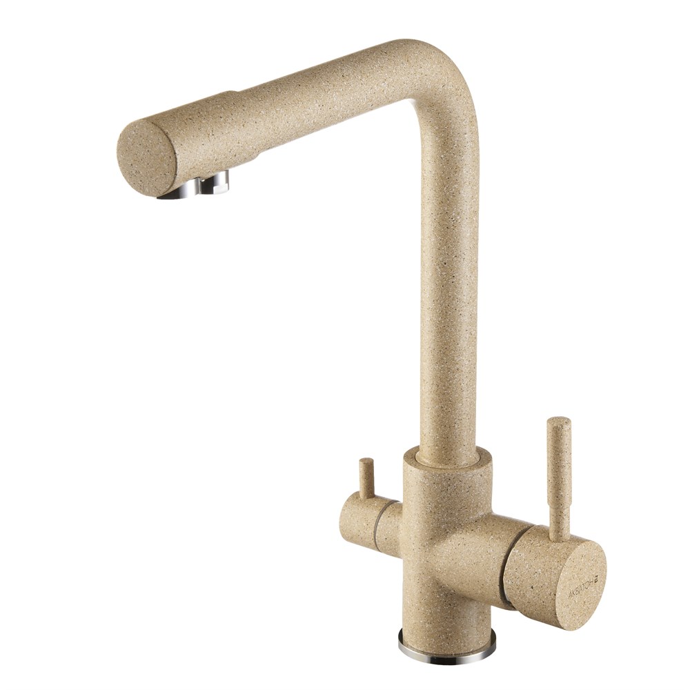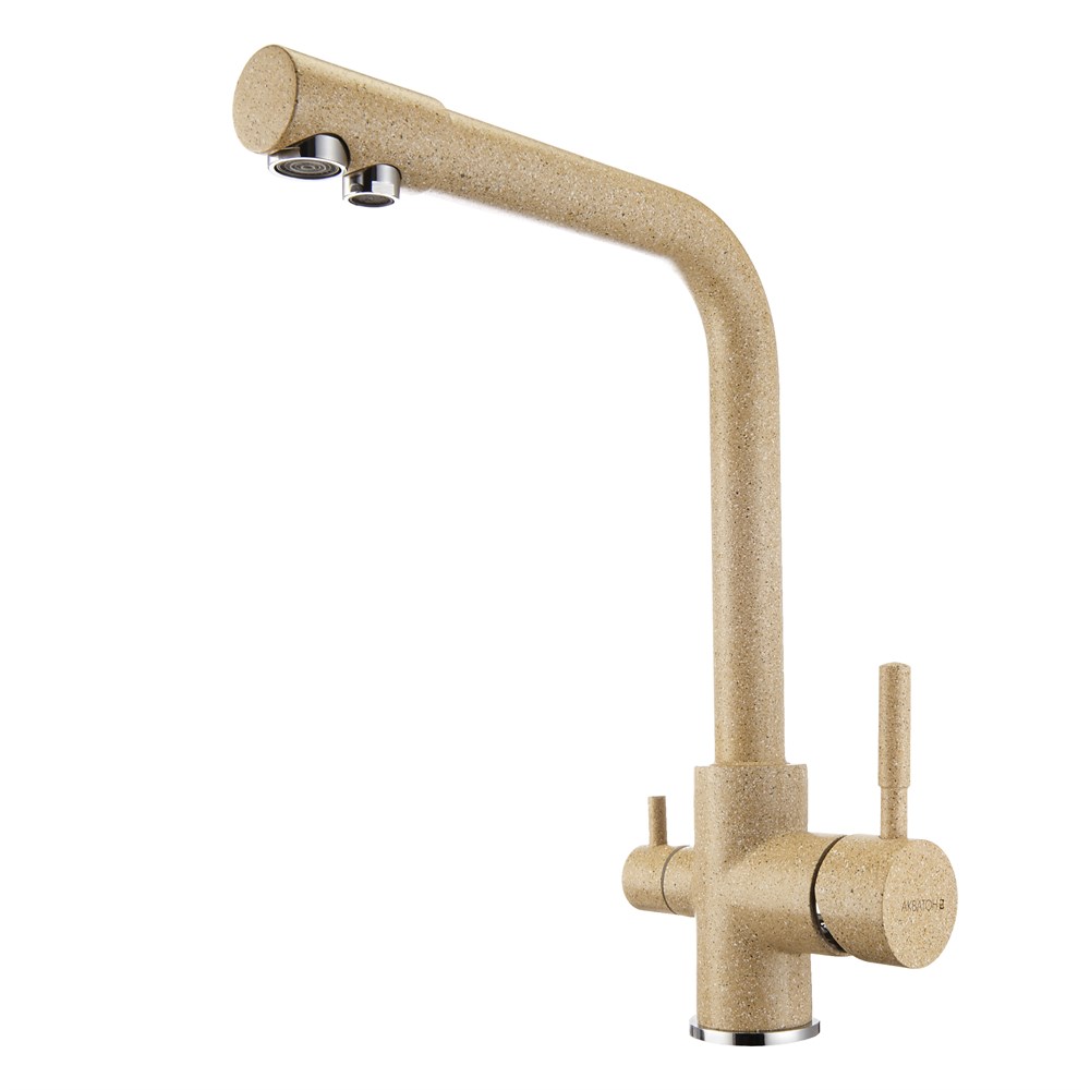 Смеситель Руан для кухонной мойки от компании Акватон. Подключение к фильтру пиьевой воды. Совмещенный излив. Цвет смесителя специально подобран в соответствии  с цветом кухонных моек Акватон из литьевого камня. Корпус смесителя выполнен из латуни, что гарантирует долгий срок эксплуатации изделия, сопротивление коррозии и безопасность для человека. Декоративное цветное покрытие отличается высокой силой сцепления с поверхностью смесителя, обеспечивая устойчивость к царапинам и сколам.