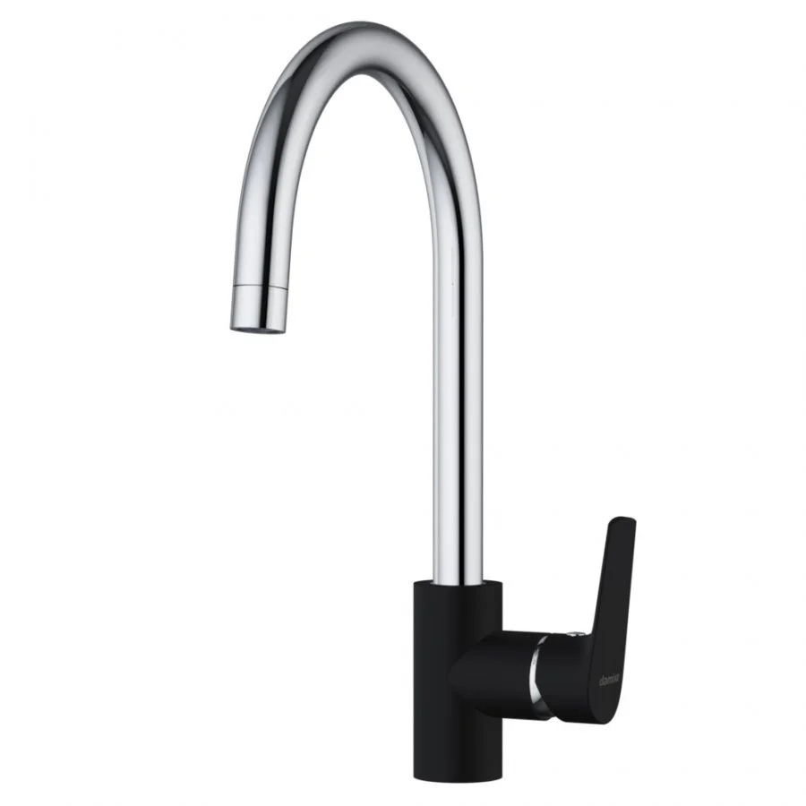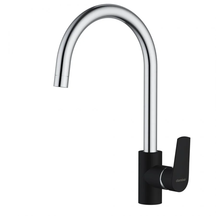 - Гармония противоположностей: черная ручка в сочетании с хромовым изливом С-образной формы смотрится выигрышно и эффектно.