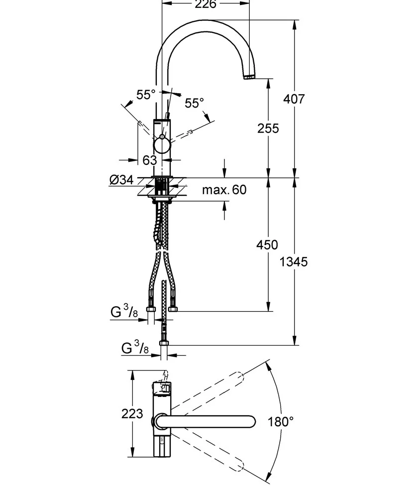 - поворотный излив, область поворота 140°, с защитой от обратного потока