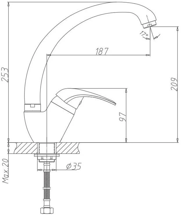 Смеситель для кухни бренда Haiba. Изготовлен из латуни. Картридж 40 мм. Укомплектован аэратором. Гибкая подводка 40 см. С поворотным изливом.
