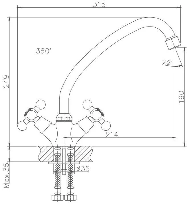 Смеситель для кухни бренда Haiba. Изготовлен из латуни. Укомплектован аэратором. Гибкая подводка 40 см. С поворотным изливом.