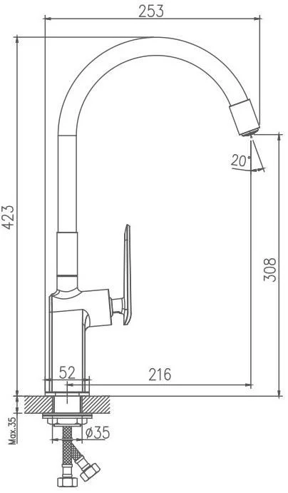 Смеситель для кухни бренда Haiba. Изготовлен из латуни. Картридж 35 мм. Укомплектован аэратором. Гибкая подводка 45 см. С поворотным изливом.