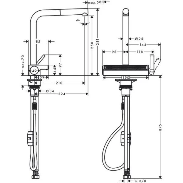 - угол поворота излива: регулировка на 3 уровня на 60°, 110° или 150°