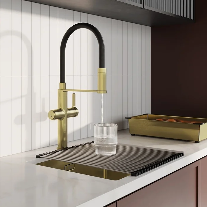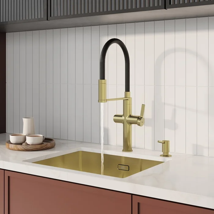 Профессиональный смеситель для кухни Ikon в матовом золоте с черным гибким изливом и отдельным каналом для фильтрованной воды. Современный, продуманный и функциональный, он успешно справляется с повседневными задачами на кухне.