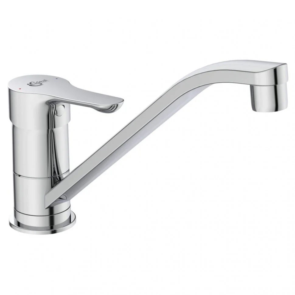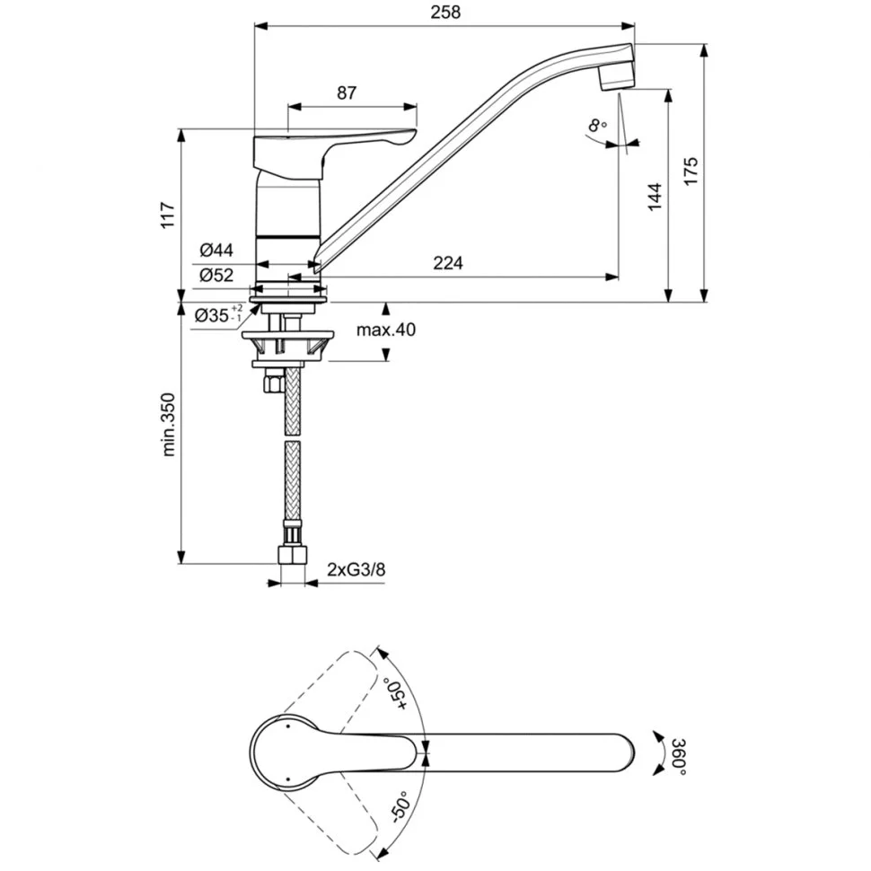 ALPHA Однорукоятковый смеситель для кухонной мойки, трубчатый поворотный излив (длина 224 мм, высота 144 мм), угол поворота 360?, керамический картридж 38 мм Firmaflow® с функцией HWTC (ограничение максимальной температуры горячей воды), с функцией CLICK (ограничение потока воды), гибкая подводка G3/8", система монтажа EASY-FIX (облегченный монтаж) с пластиковой опорной пластиной для более стабильного монтажа на мойке из нержавеющей стали, аэратор Perlator, металлическая рукоятка с индикаторами горячей / холодной воды