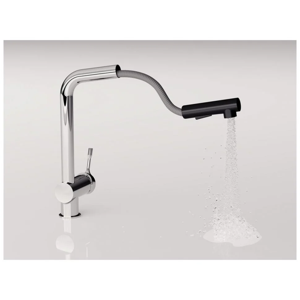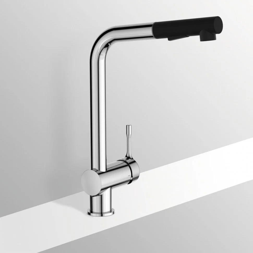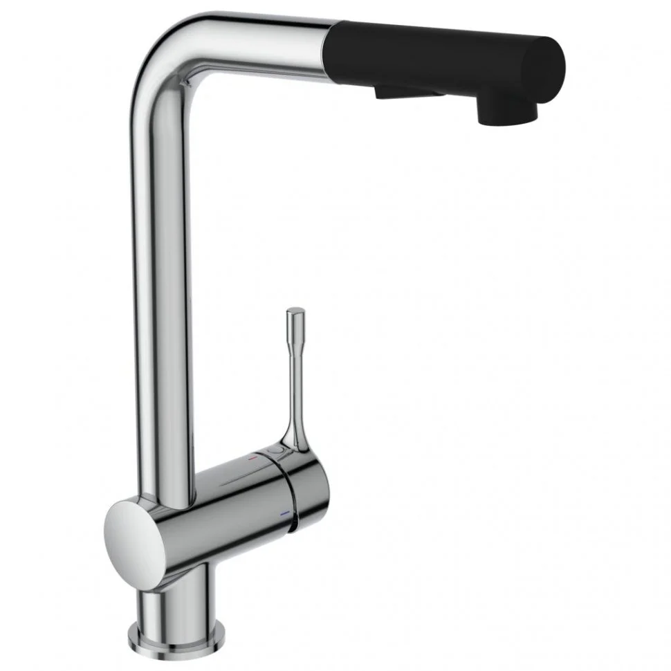 CERALOOK Однорукоятковый смеситель для кухонной мойки с высоким поворотным выдвижным изливом (длина 225 мм, высота 322 мм), угол поворота 360?, рукоятка сбоку, 2-х функциональный душ, керамический картридж 38 мм Firmaflow® с функцией HWTC (ограничение максимальной температуры горячей воды), с функцией CLICK (ограничение потока воды), гибкая подводка G3/8" (антибактериальные шланги PEX), монтаж IS-Fix - крепеж на центральной гайке M33x1,5 с двумя блокирующими винтами, с пластиковой опорной пластиной для более стабильного монтажа на мойке из нержавеющей стали, аэратор Perlator, металлическая рукоятка, индикаторы горячей / холодной воды на корпусе