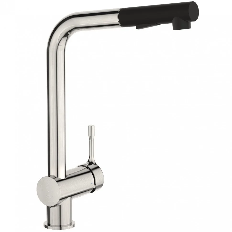 CERALOOK Однорукоятковый смеситель для кухонной мойки с высоким поворотным выдвижным изливом (длина 225 мм, высота 322 мм), угол поворота 360?, рукоятка сбоку, 2-х функциональный душ, керамический картридж 38 мм Firmaflow® с функцией HWTC (ограничение максимальной температуры горячей воды), с функцией CLICK (ограничение потока воды), гибкая подводка G3/8" (антибактериальные шланги PEX), монтаж IS-Fix - крепеж на центральной гайке M33x1,5 с двумя блокирующими винтами, с пластиковой опорной пластиной для более стабильного монтажа на мойке из нержавеющей стали, аэратор Perlator, металлическая рукоятка, индикаторы горячей / холодной воды на корпусе