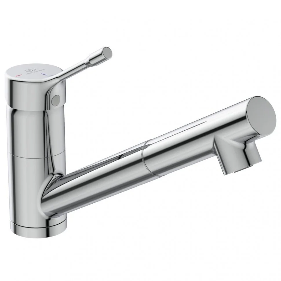 CERALOOK Однорукоятковый смеситель для кухонной мойки, трубчатый поворотный выдвижной излив (длина 220 мм, высота 112 мм), угол поворота 360?, технология Blue Start, керамический картридж 38 мм Firmaflow® с функцией HWTC (ограничение максимальной температуры горячей воды), с функцией CLICK (ограничение потока воды), гибкая подводка G3/8" (антибактериальные шланги PEX), монтаж IS-Fix - крепеж на центральной гайке M33x1,5 с двумя блокирующими винтами с пластиковой опорной пластиной для более стабильного монтажа на мойке из нержавеющей стали, аэратор Perlator, металлическая рукоятка с индикаторами горячей / холодной воды (индикатор холодной воды расположен по центру)