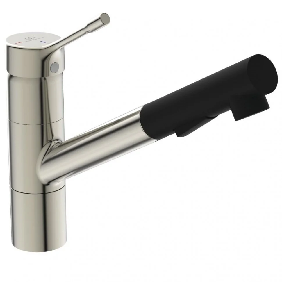 CERALOOK Однорукоятковый смеситель для кухонной мойки, трубчатый поворотный выдвижной излив (длина 233 мм, высота 170 мм), 2-х функциональный душ, угол поворота 360?, технология Blue Start, керамический картридж 38 мм Firmaflow® с функцией HWTC (ограничение максимальной температуры горячей воды), с функцией CLICK (ограничение потока воды), гибкая подводка G3/8" (антибактериальные шланги PEX), монтаж IS-Fix - крепеж на центральной гайке M33x1,5 с двумя блокирующими винтами с пластиковой опорной пластиной для более стабильного монтажа на мойке из нержавеющей стали, аэратор Perlator, металлическая рукоятка с индикаторами горячей / холодной воды (индикатор холодной воды расположен по центру)