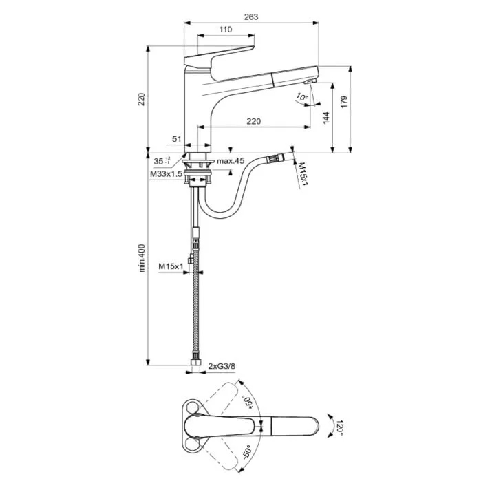 CERAPLAN III Смеситель для кухонной мойки с вытяжным изливом, монтаж IS-Fix - крепеж на центральной гайке M 33x1,5 с двумя блокирующими винтами (обеспечивает стабильную фиксацию смесителя), с пластиковой опорной пластиной для более стабильного монтажа на мойке из нержавеющей стали, литой излив, угол поворота 120°, аэратор Perlator, керамический картридж 35 мм с функцией HWTC (ограничение максимальной температуры горячей воды), металлическая рукоятка с индикаторами горячей / холодной воды, гибкая подводка G3/8" (2 шланга для подключения к водопроводу), укороченный гибкий шланг G3/8 и пластиковый соединительный шланг 1,5 м для подключения вытяжного излива