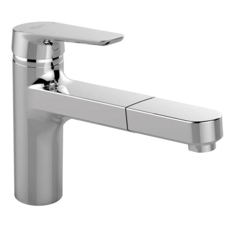 CERAPLAN III Смеситель для кухонной мойки с вытяжным изливом, монтаж IS-Fix - крепеж на центральной гайке M 33x1,5 с двумя блокирующими винтами (обеспечивает стабильную фиксацию смесителя), с пластиковой опорной пластиной для более стабильного монтажа на мойке из нержавеющей стали, литой излив, угол поворота 120°, аэратор Perlator, керамический картридж 35 мм с функцией HWTC (ограничение максимальной температуры горячей воды), металлическая рукоятка с индикаторами горячей / холодной воды, гибкая подводка G3/8" (2 шланга для подключения к водопроводу), укороченный гибкий шланг G3/8 и пластиковый соединительный шланг 1,5 м для подключения вытяжного излива