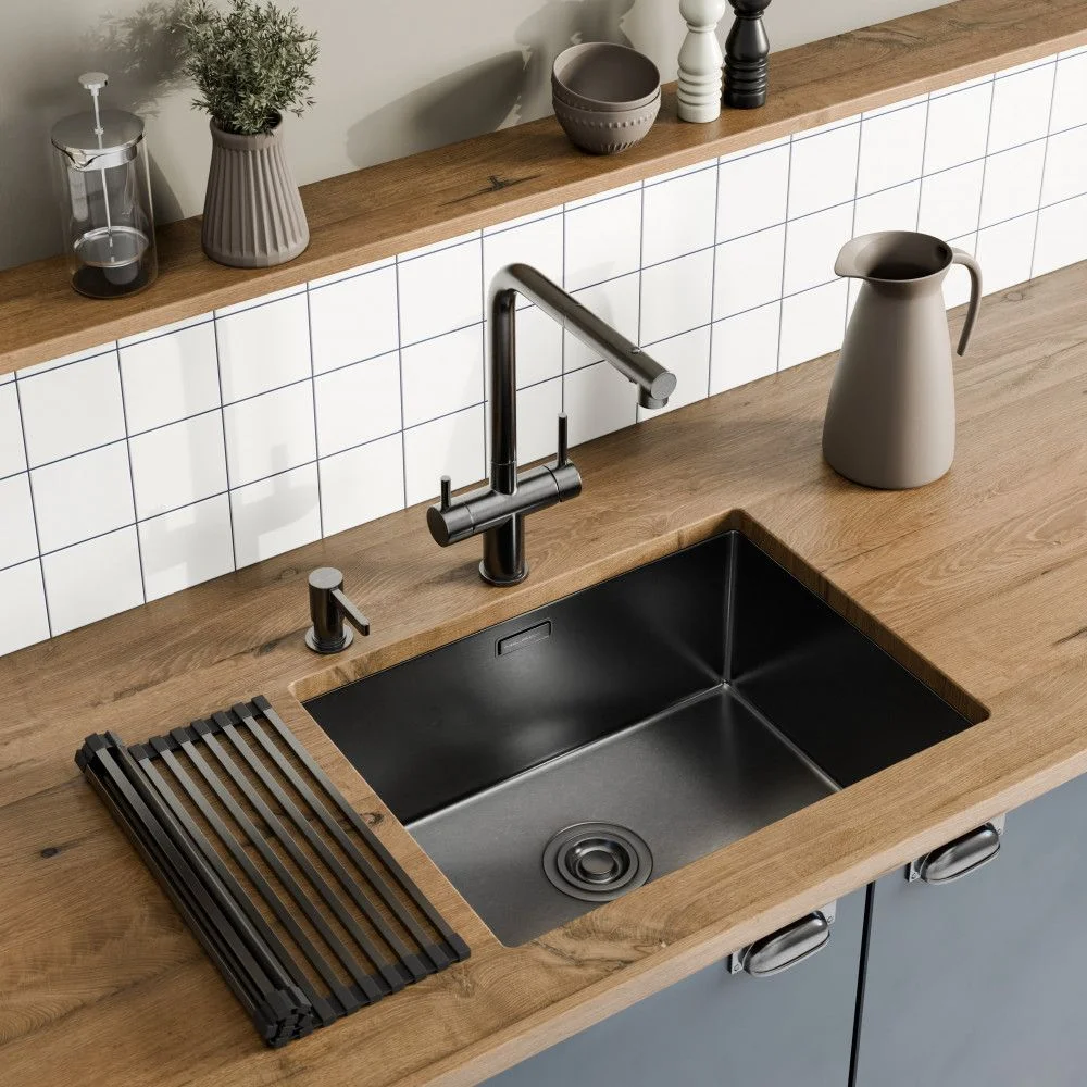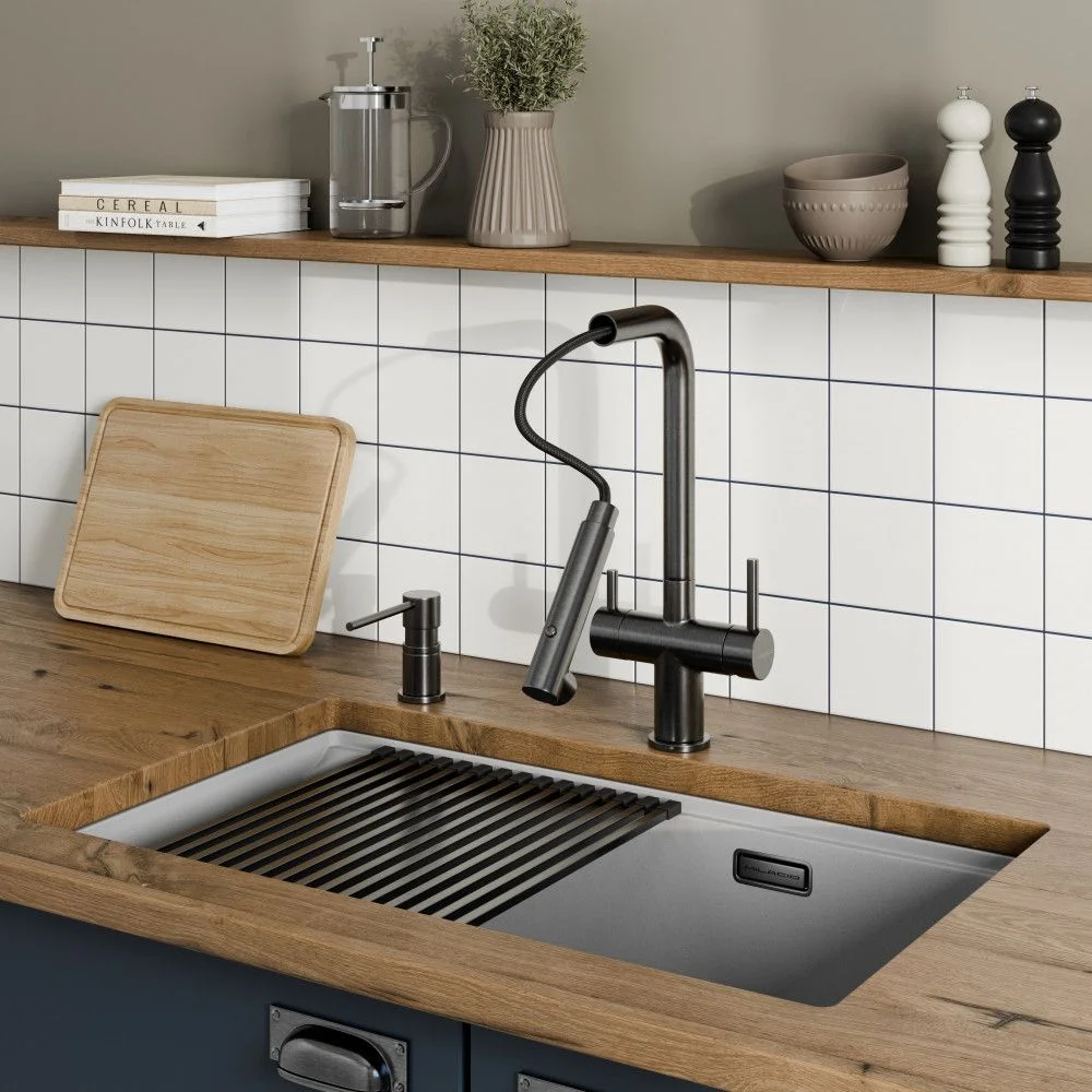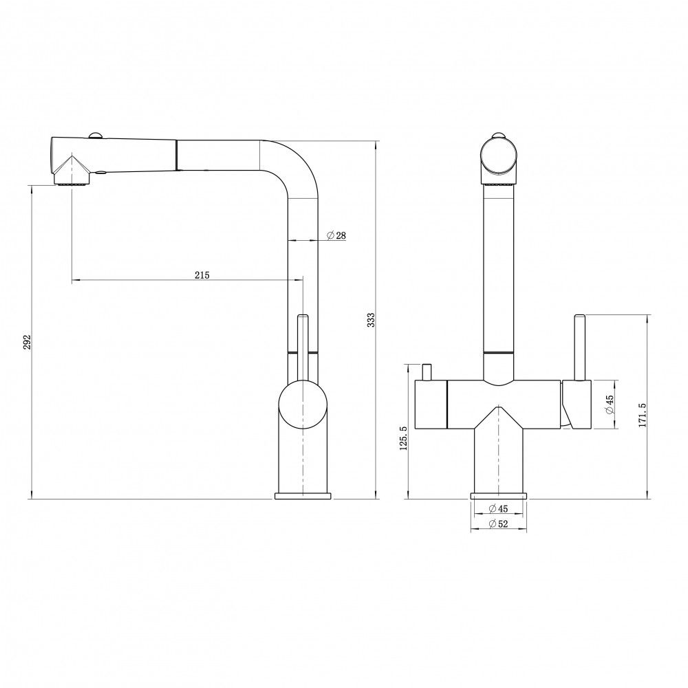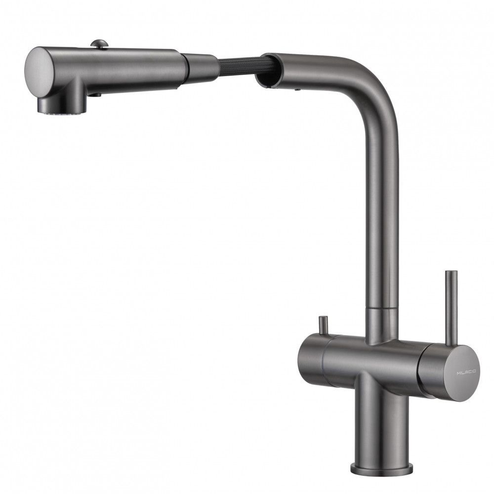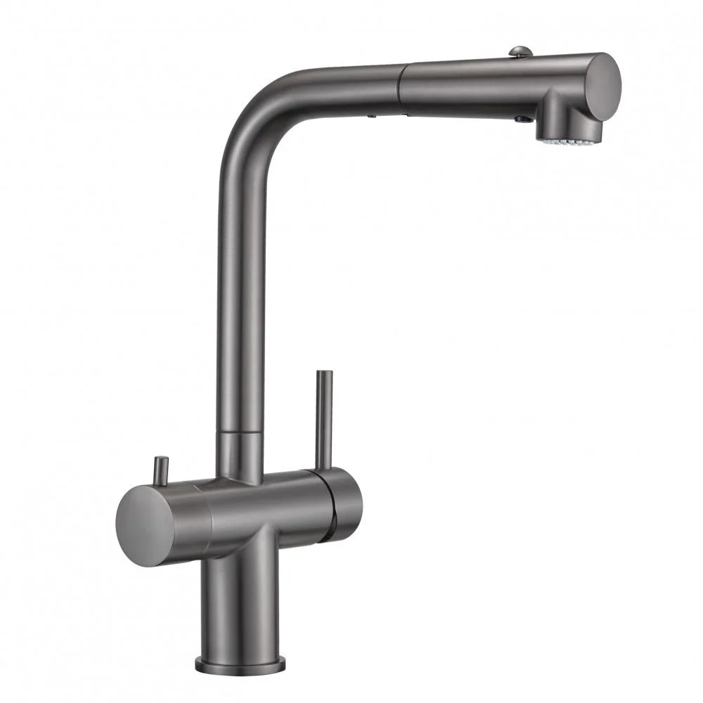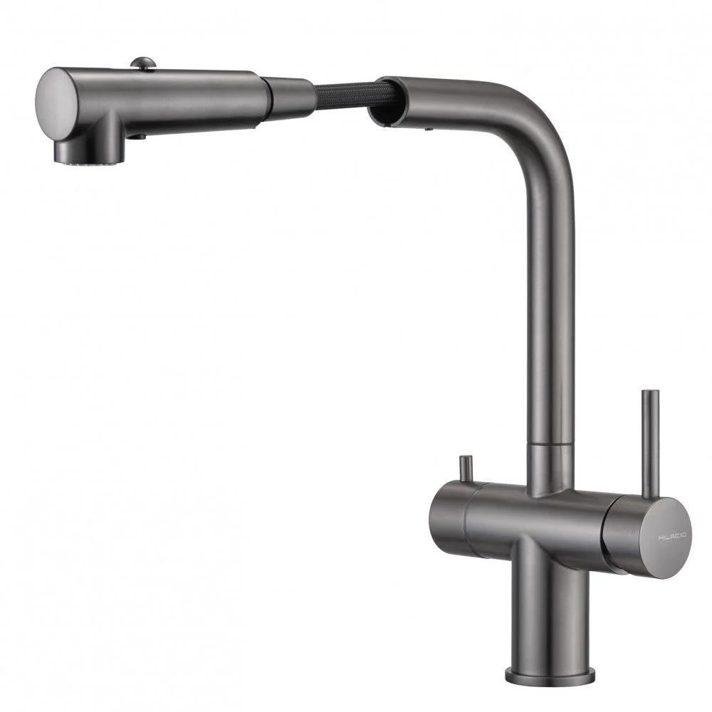 Смеситель 1 шт, Крепежный комплект 1 шт, Подводка воды гибкая 5 шт, Гибкий вытяжной шланг 1 шт, Вытяжная лейка 1 шт, Груз для шланга 1 шт, Переходник для фильтра 1 шт, Переходник для вытяжного шланга 1 шт, Паспорт/Гарантийный талон 1 шт