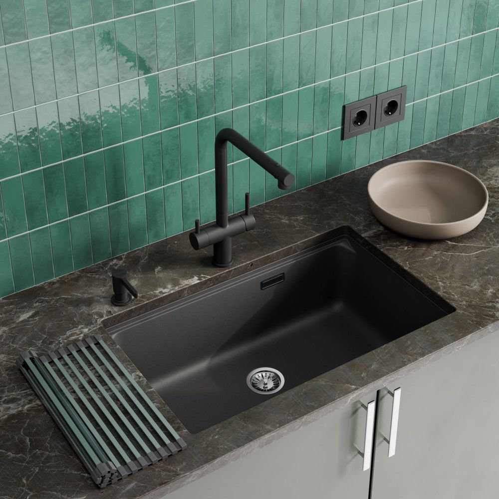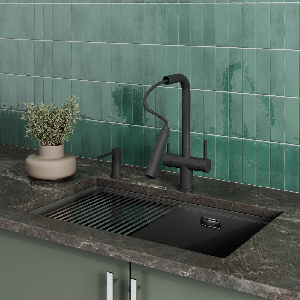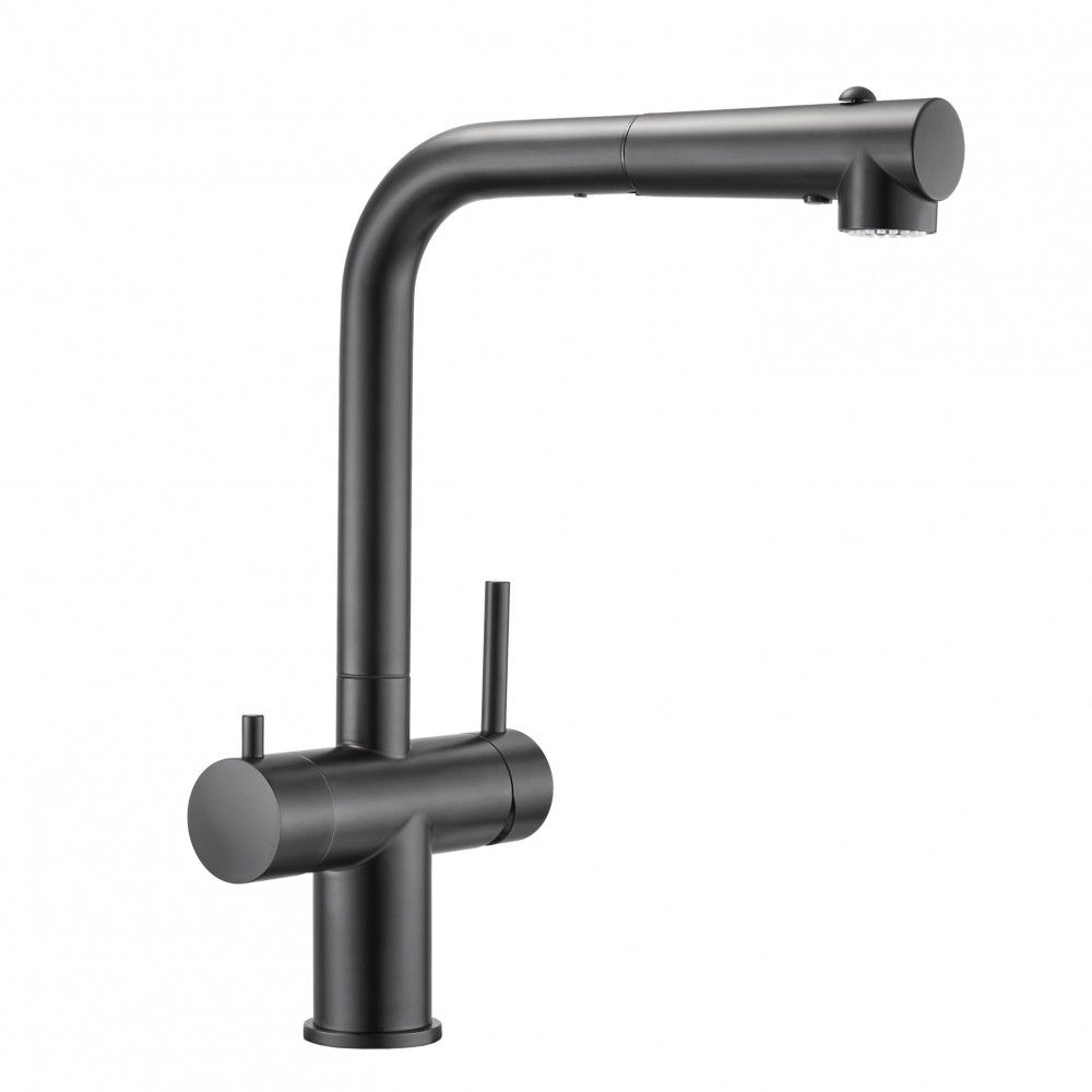 Смеситель 1 шт, Крепежный комплект 1 шт, Подводка воды гибкая 5 шт, Гибкий вытяжной шланг 1 шт, Вытяжная лейка 1 шт, Груз для шланга 1 шт, Переходник для фильтра 1 шт, Переходник для вытяжного шланга 1 шт, Паспорт/Гарантийный талон 1 шт