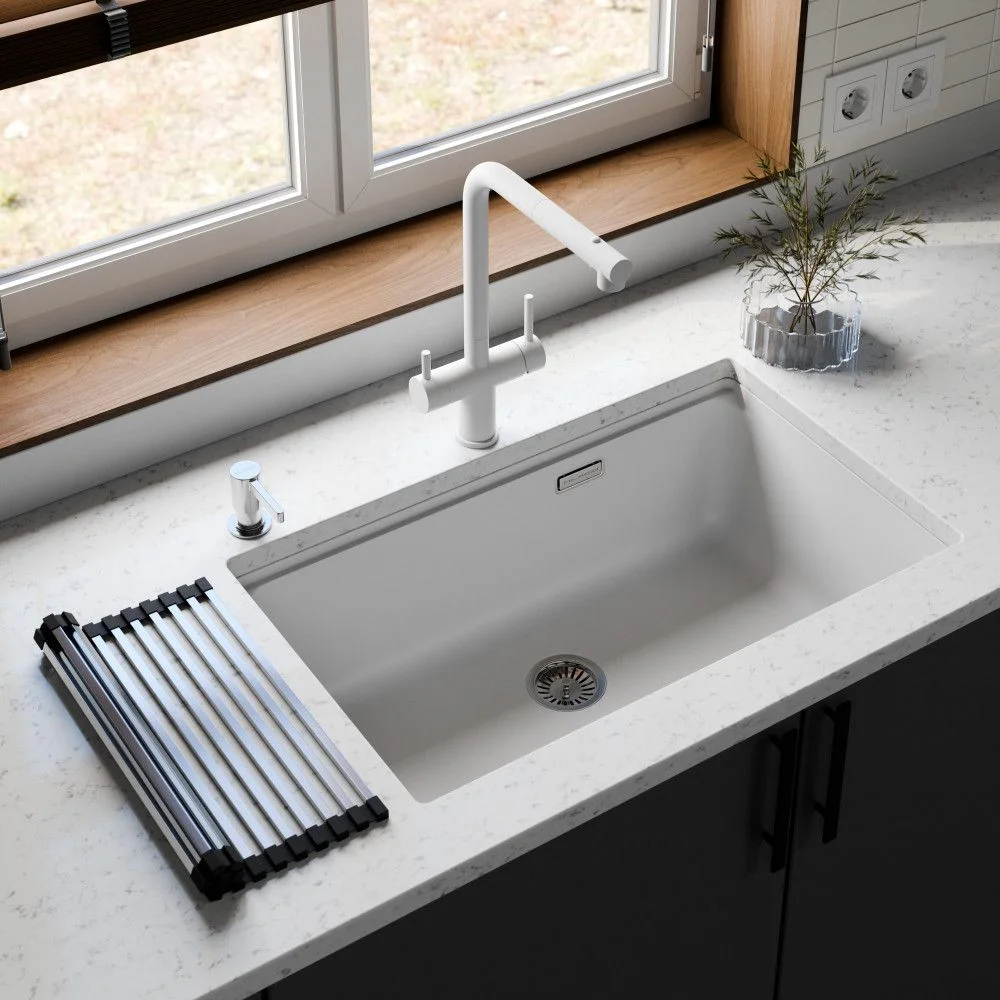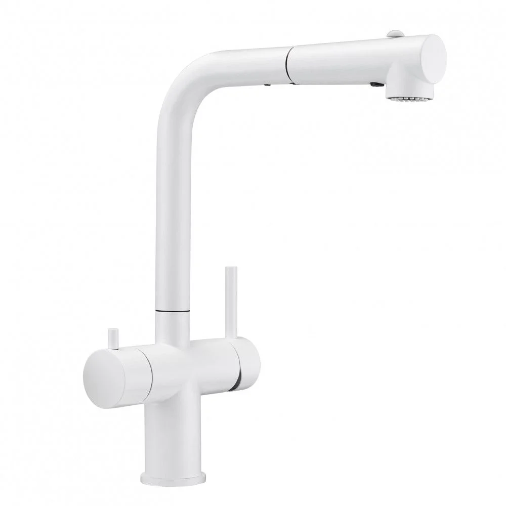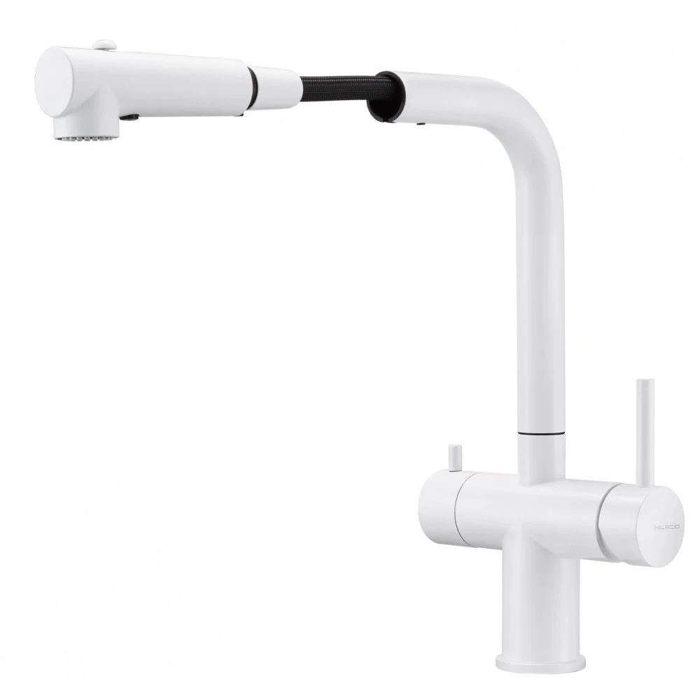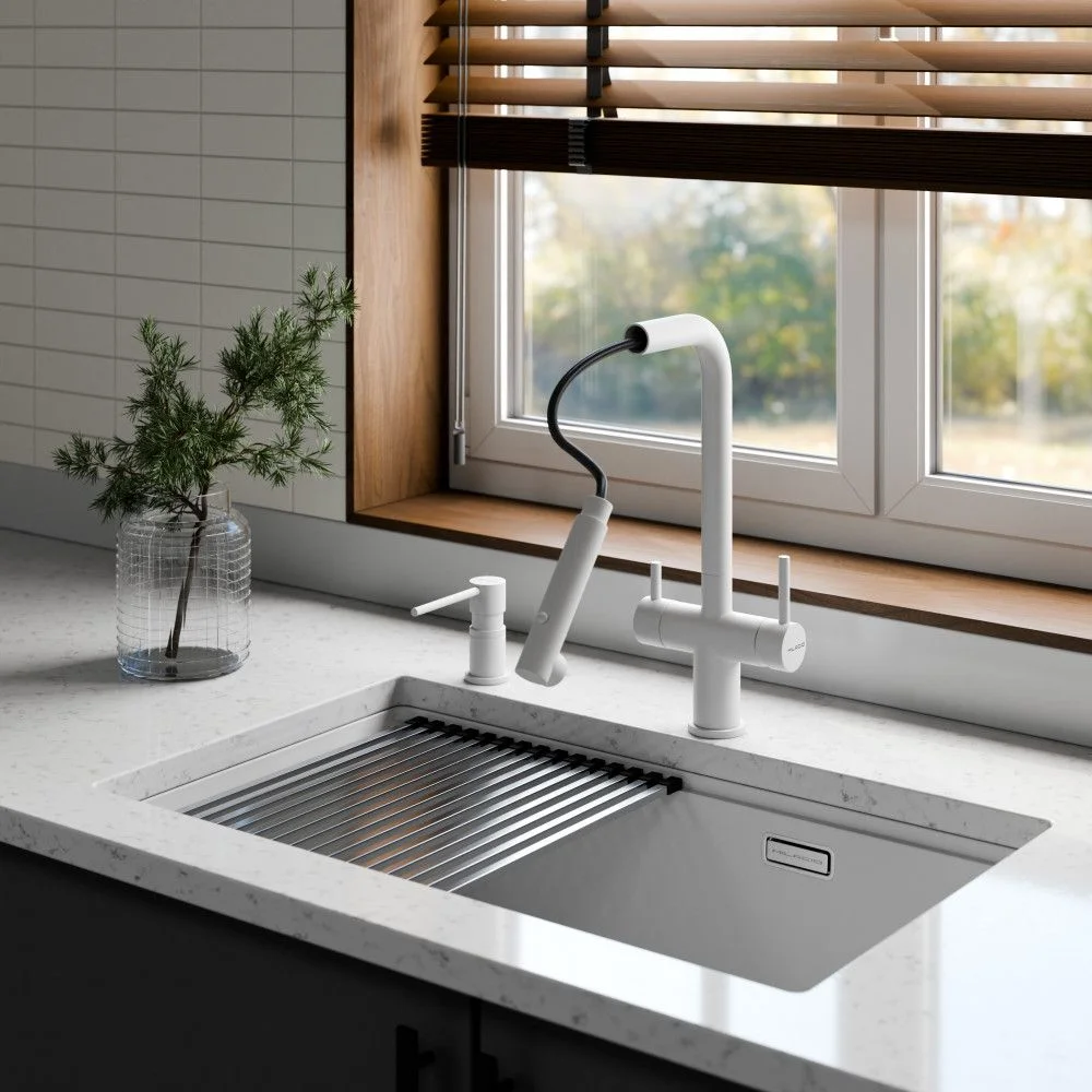 Смеситель 1 шт, Крепежный комплект 1 шт, Подводка воды гибкая 5 шт, Гибкий вытяжной шланг 1 шт, Вытяжная лейка 1 шт, Груз для шланга 1 шт, Переходник для фильтра 1 шт, Переходник для вытяжного шланга 1 шт, Паспорт/Гарантийный талон 1 шт
