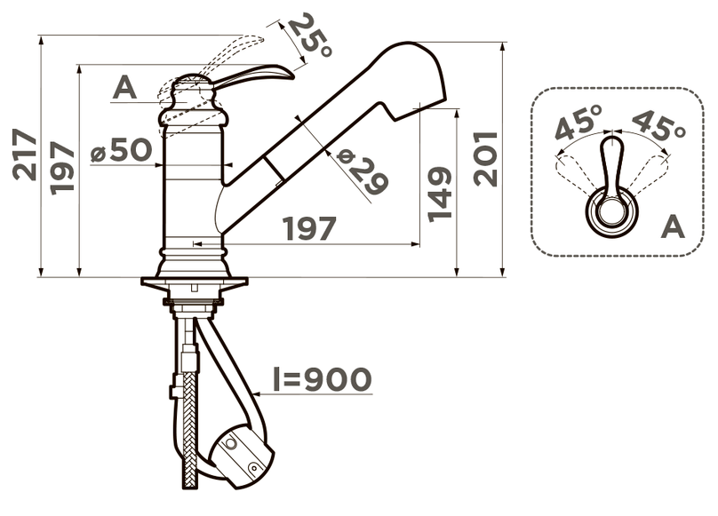 • Классический дизайн и невероятно удобная конструкция смесителя, сочетающая в себе вытяжной шланг и функцию переключения воды на 2 режима: струя и душ;