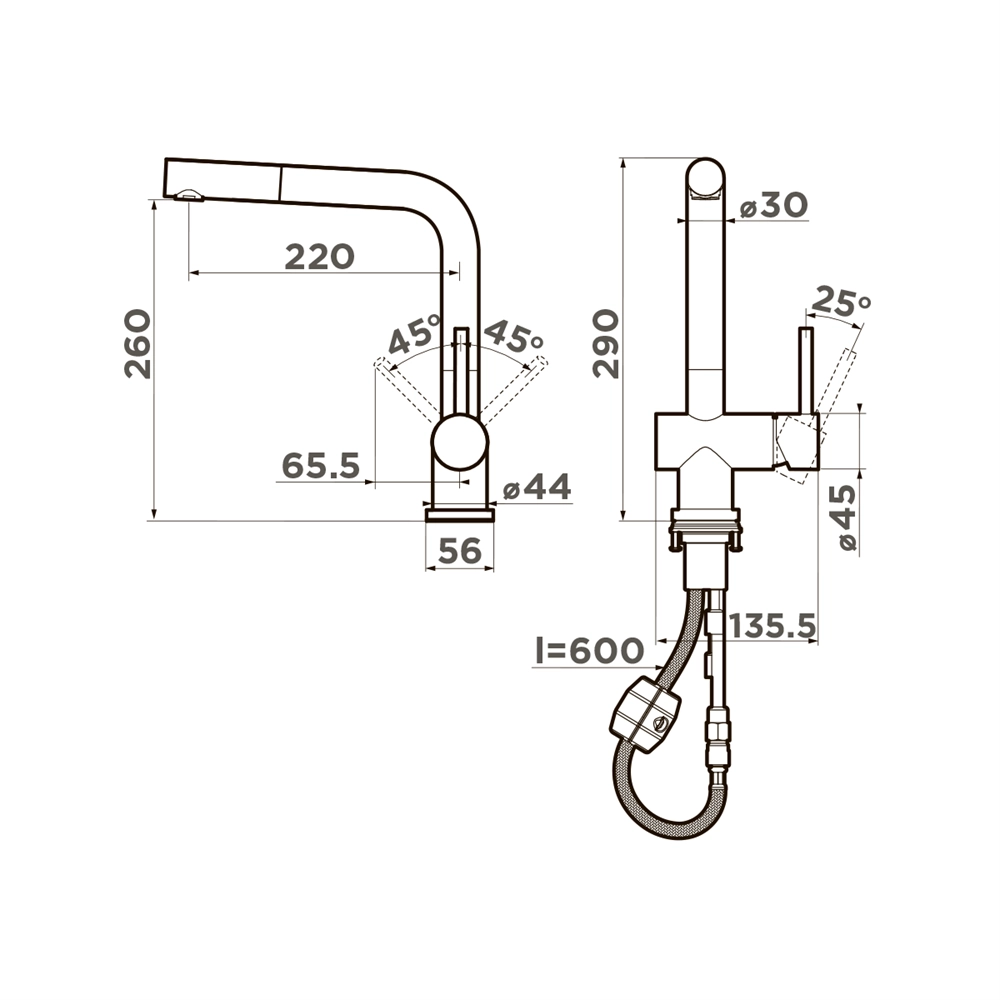 • Практичный однорычажный смеситель выполнен в современном стиле и снабжен высоким поворотным изливом и вытяжным шлангом;