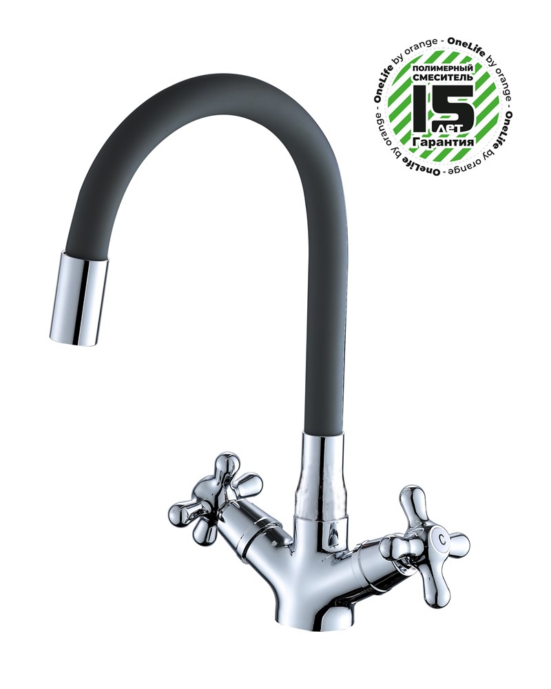 Двухвентильный полимерный смеситель для кухни OneLife P03-007cr - гибкий поворотный излив. Керамические кран-буксы обеспечат легкое управление напором и температурой воды. Вместо привычного латунного сплава он изготовлен из запатентованного высокотехнологичного полимера (выдерживает 510 000 циклов и 53 АТМ без замены изделия после теста на цикличность, исключает возможность обжечься при касании, не подвержен коррозии и окислению, стойкий к отрицательным температурам), что обеспечивает срок службы более 15 лет. Встроенный аэратор экономит воду и, обогащая струю воздухом, делает её мягкой и без брызг. Цвет глянцевый хром, излив матовый черный.