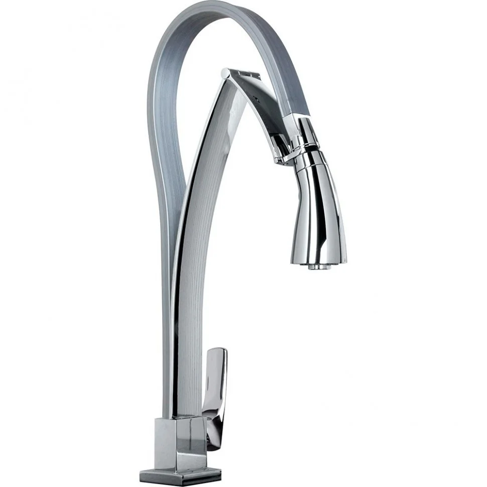Однорычажный смеситель для кухни с гибким изливом и механическим переключателем струя/душ позволяет наполнять емкости за пределами моечной зоны, использовать глубокую посуду. Блеск хромового покрытия контрас