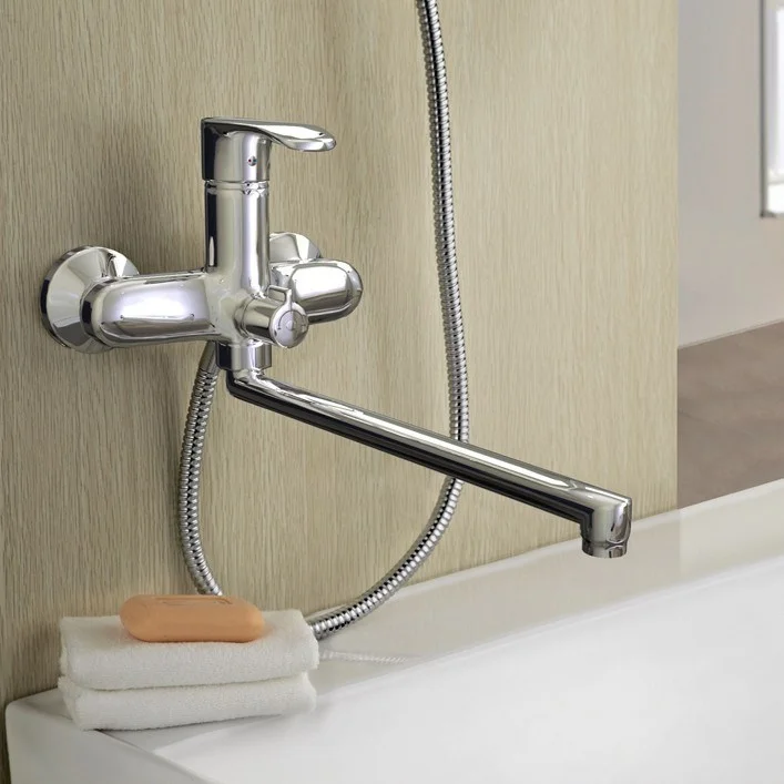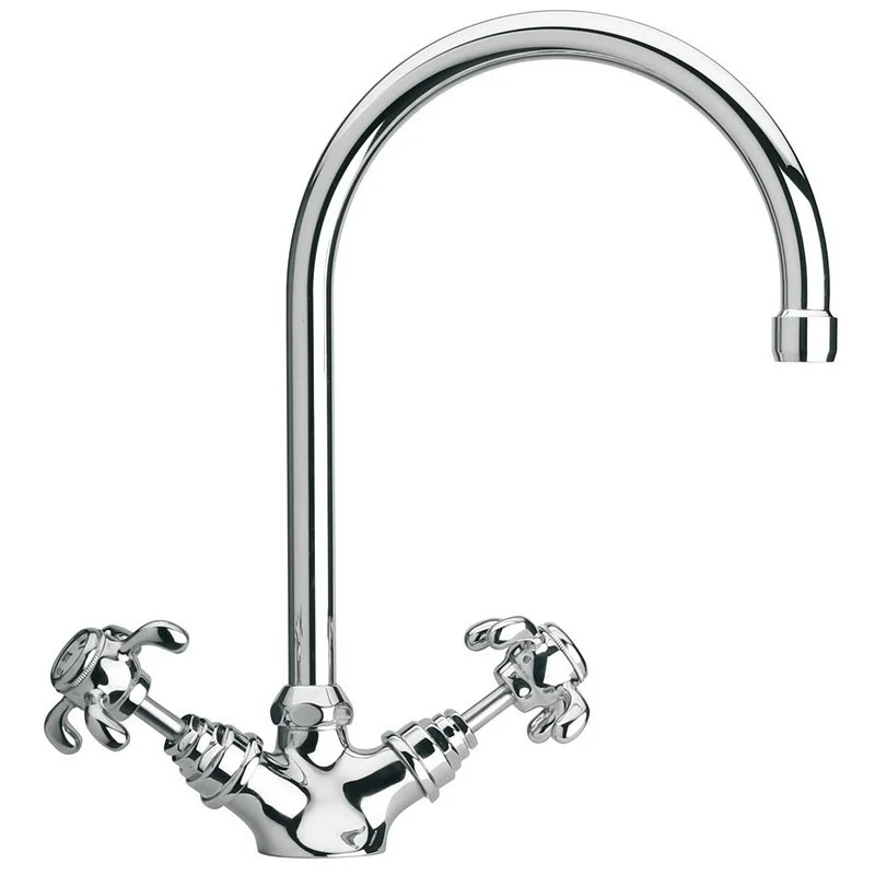 Высокий корпус и поворотный излив делают двухвентильный смеситель незаменимым для кухни, позволяя наполнить кастрюлю или вазу водой, помыть посуду. Контраст традиционной формы излив