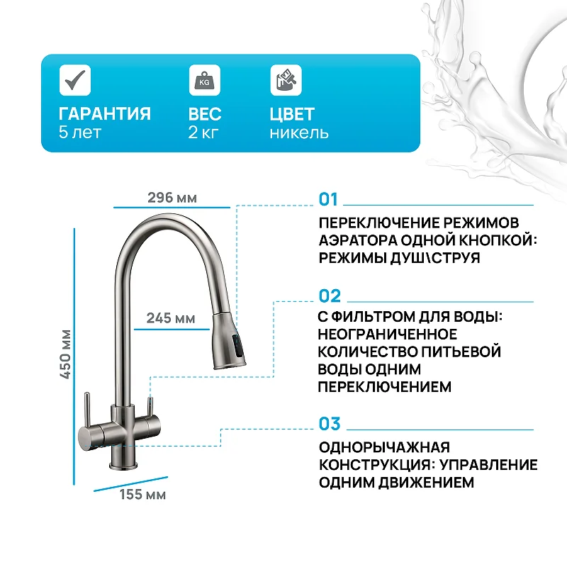 Гибкая подводка из нержавеющей стали 40 см, Усиленный комплект крепления, Переходник цанга для подключения системы фильтрации питьевой воды, Запасной аэратор.