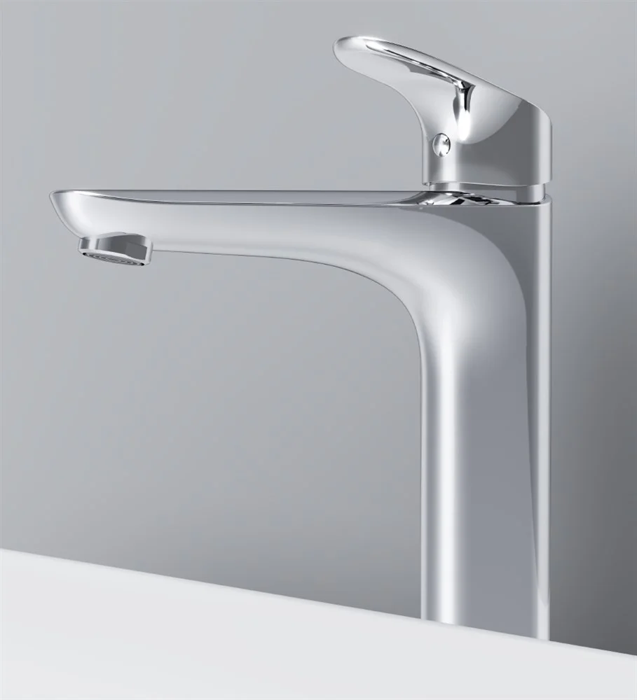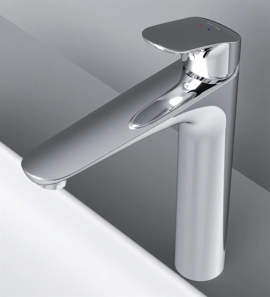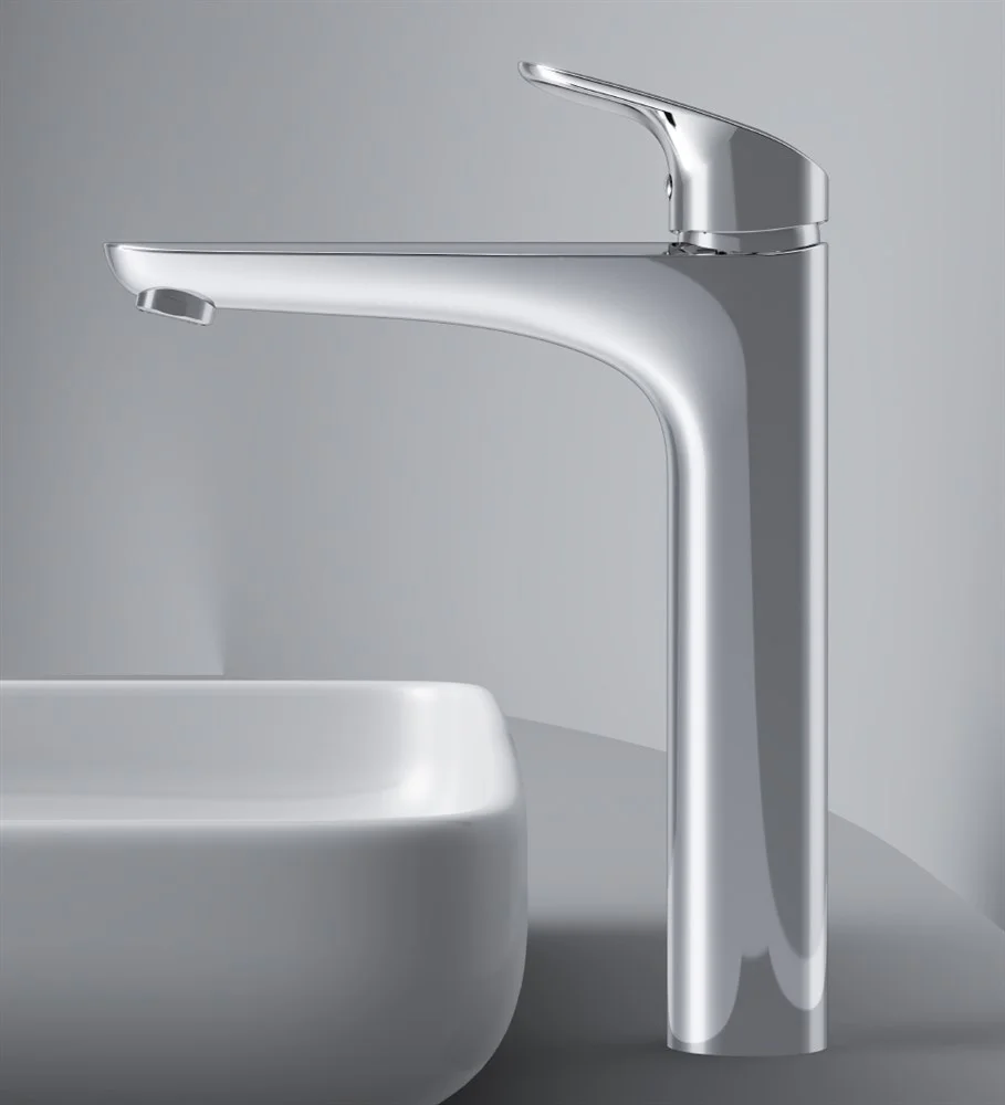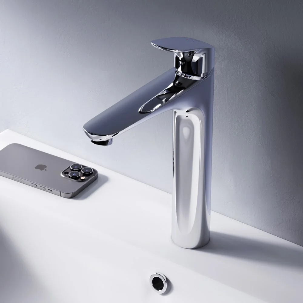 Высокий излив придает смесителю утонченный вид и идеально подойдет для раковины с глубокой чашей а благодаря обширной зоне движения ручки управлять температурой воды еще проще. ""