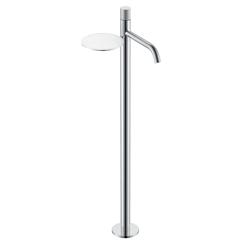 У смесителя есть удобная ручка для простой регулировки потока и температуры воды. Также в его конструкции предусмотрена полка, на которой можно разместить необходимые мелочи — например, мыло, косметику или телефон. Благодаря чему смеситель становится не только украшением ванной комнаты, но и удобным решением.