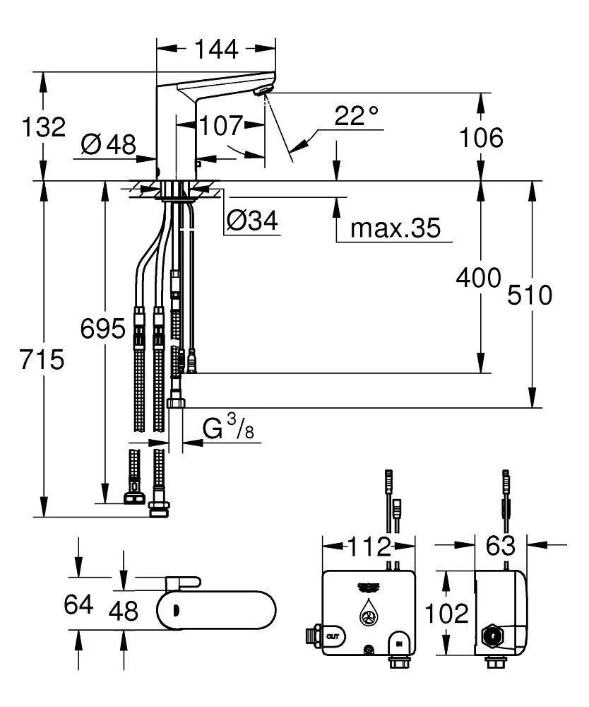 Eurosmart Cosmopolitan E Powerbox с инфракрасным датчиком для двусторонней связи для мониторинга, настройки и сервисного обслуживания Инфракрасная электроника для раковины 1/2" со смешиванием и с регулируемым ограничителем температуры включает Powerbox с системой энергонакопления GROHE EcoJoy® 6,0 л/мин включает все соединительные гибкие шланги oбратный клапан грязеулавливающий фильтр система быстрого монтажа Powerbox генератор энергии с гидротурбиной внутренний блок энергосбережения с использованием 60 сек/24 ч. в режиме ожидания, 260 сек./100 ч. в режиме ожидания с дополнительным резервным электропитанием 7 предустановленных режимов: - автоматический смыв - термическая дезинфекция - моющий режим дополнительные функции и точные настройки с помощью пульта дистанционного управления 36 407 минимальное давление 1,0 бар