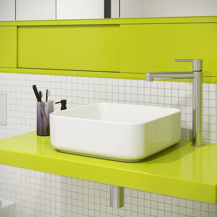 Стильный высокий Смеситель для раковины удачно сочетает актуальный современный дизайн и классический цвет хрома. Тонкая удлиненная ручка добавляет смесителю изящества и комфорт в управлении. Расстояние между ручкой и изливом увеличено для большего удобства.