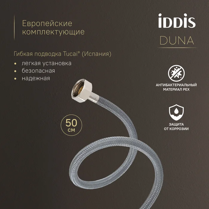 — Гибкая подводка Tucai® (Испания): безопасна для здоровья благодаря шлангу из нетоксичного материала PEX с антибактериальным эффектом, нейлоновая оплетка для защиты от коррозии и износа, увеличенная длина 50 см упрощает монтаж.