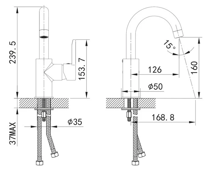 - Подключение к системе водоснабжения: Гибкая подводка из нетоксичной EPDM резины в оплетке из нержавеющей стали, М10 - 1/2, длина 350 мм