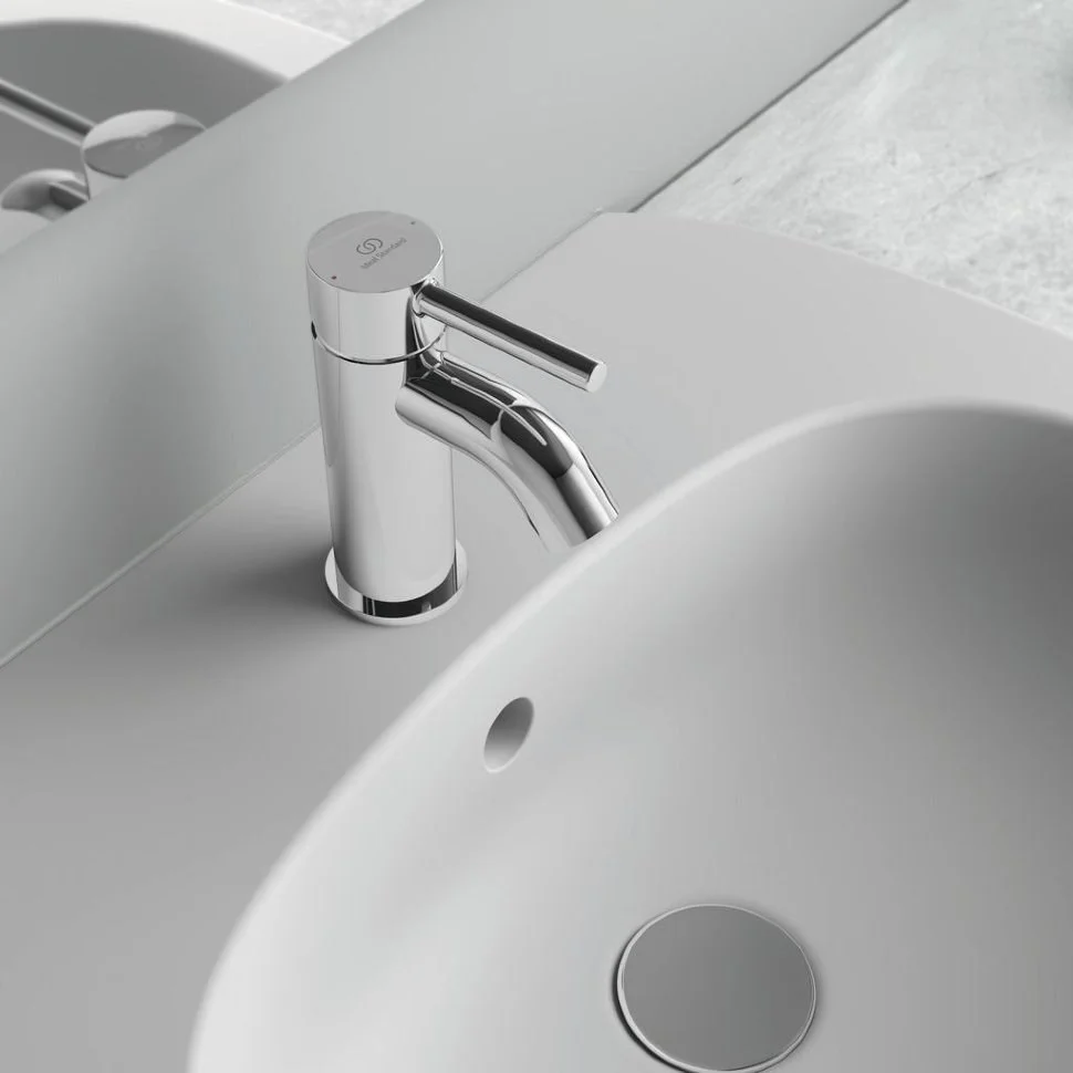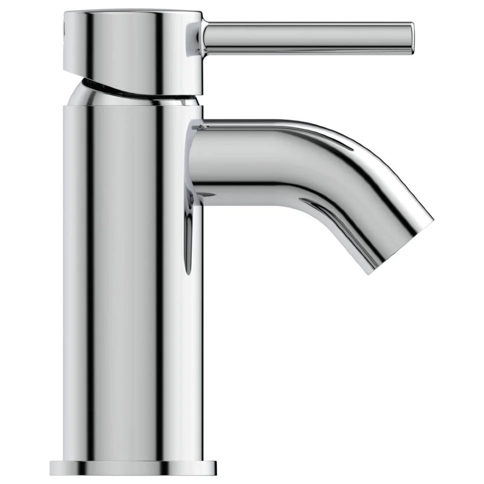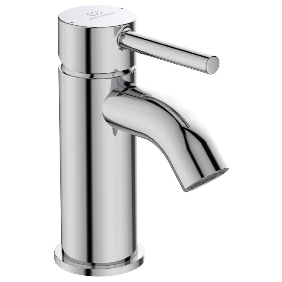 CERALINE Piccolo Однорукоятковый смеситель для умывальника (уменьшенная версия), картридж 35 мм с функцией HWTC (ограничение максимальной температуры горячей воды), гибкая подводка G3/8", система монтажа EASY-FIX (облегченный монтаж), аэратор Cashe с ограничением потока 5 л/мин., металлическая рукоятка с индикаторами горячей / холодной воды, без донного клапана