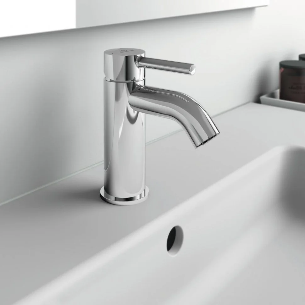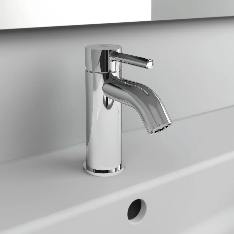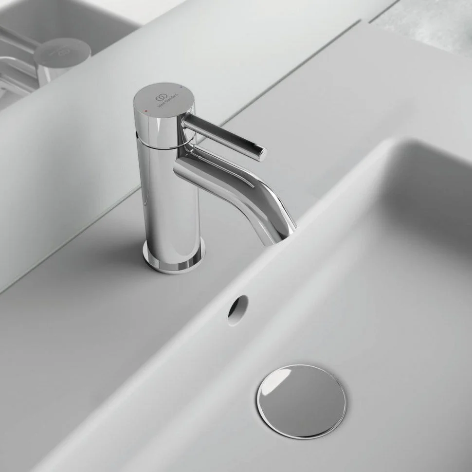 CERALINE Однорукоятковый смеситель для умывальника, картридж 35 мм с функцией HWTC (ограничение максимальной температуры горячей воды), с функцией CLICK (ограничение потока воды), гибкая подводка G3/8", система монтажа EASY-FIX (облегченный монтаж), аэратор Cashe, металлическая рукоятка с индикаторами горячей / холодной воды, металлический донный клапан