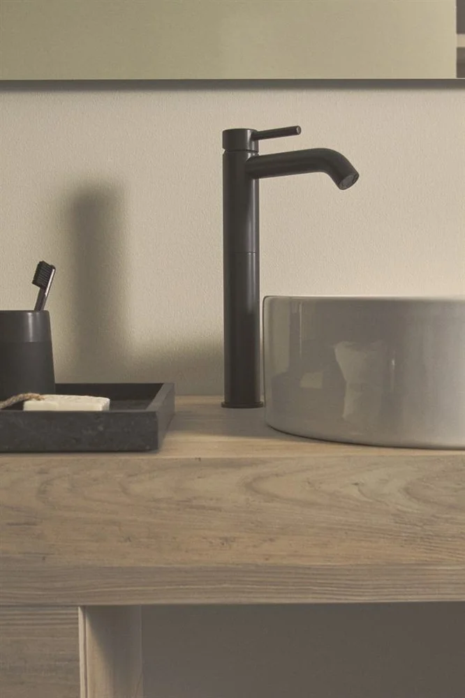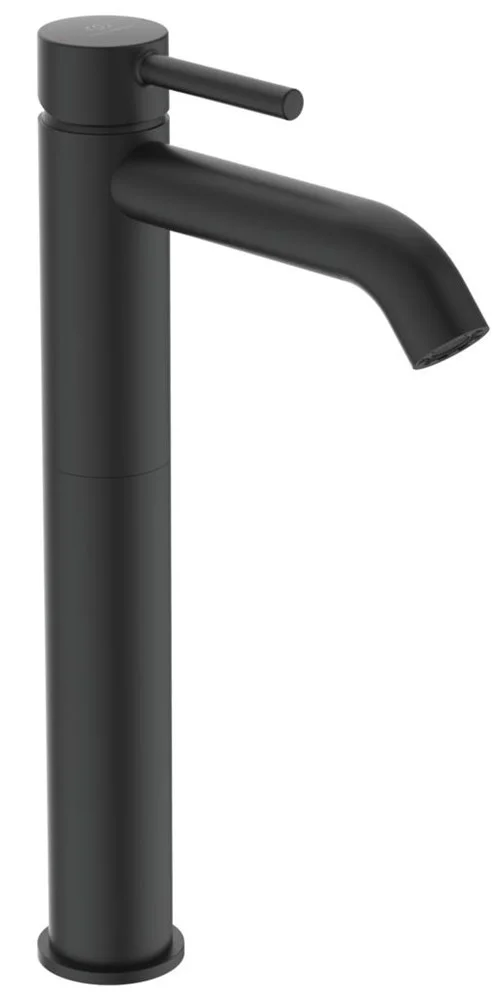 CERALINE Vessel Однорукоятковый смеситель для умывальника с удлиненным корпусом, картридж 28 мм Firmaflow® с функцией HWTC (ограничение максимальной температуры горячей воды), гибкая подводка G3/8", монтаж IS-Fix - крепеж на центральной гайке M 33x1,5 с двумя блокирующими винтами (обеспечивает стабильную фиксацию смесителя), аэратор Cashe с ограничением потока 5 л/мин., металлическая рукоятка с индикаторами горячей / холодной воды, без донного клапана