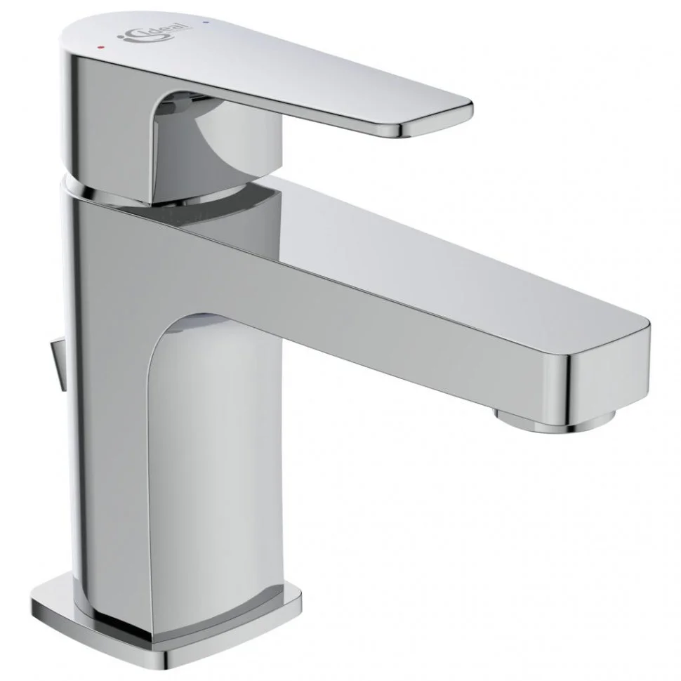 CERAFINE D Однорукоятковый смеситель для умывальника, картридж 28 мм FirmaFlow с функцией HWTC (ограничение максимальной температуры горячей воды), гибкая подводка G3/8", система монтажа EASY-FIX (облегченный монтаж), аэратор Perlator, с ограничением потока 5 л/мин., металлическая рукоятка с индикаторами горячей / холодной воды, пластиковый донный клапан