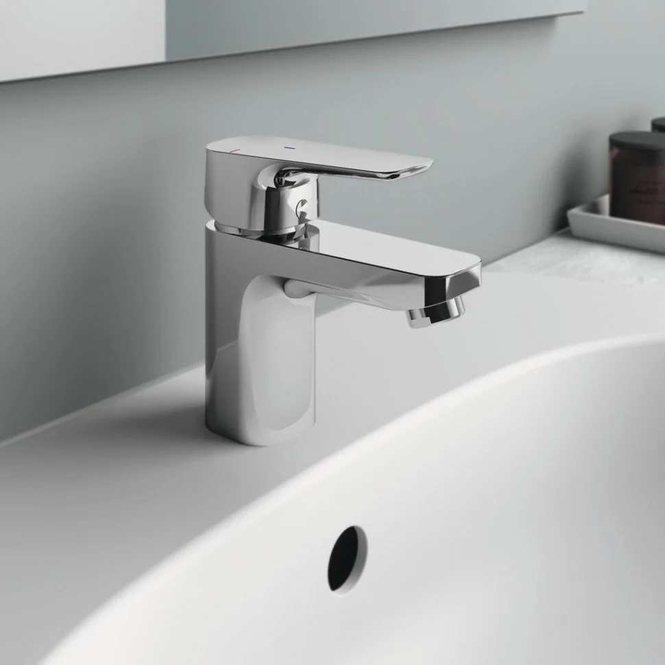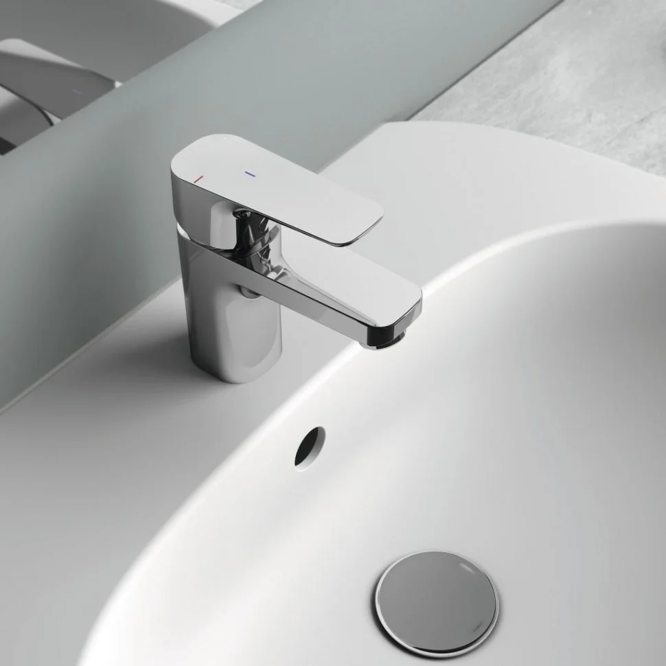 CERAPLAN III SLIM Однорукоятковый смеситель для умывальника без донного клапана, технология Blue start®, система монтажа EASY-FIX (облегченный монтаж), гибкая подводка G3/8" (шланги PEX), керамический картридж FirmaFlow 38 мм с функцией HWTC (ограничение максимальной температуры горячей воды), металлическая рукоятка с индикаторами горячей / холодной воды (Blue start® - индикатор холодной воды расположен по центру), аэратор Perlator, ограничение потока 5 л/мин