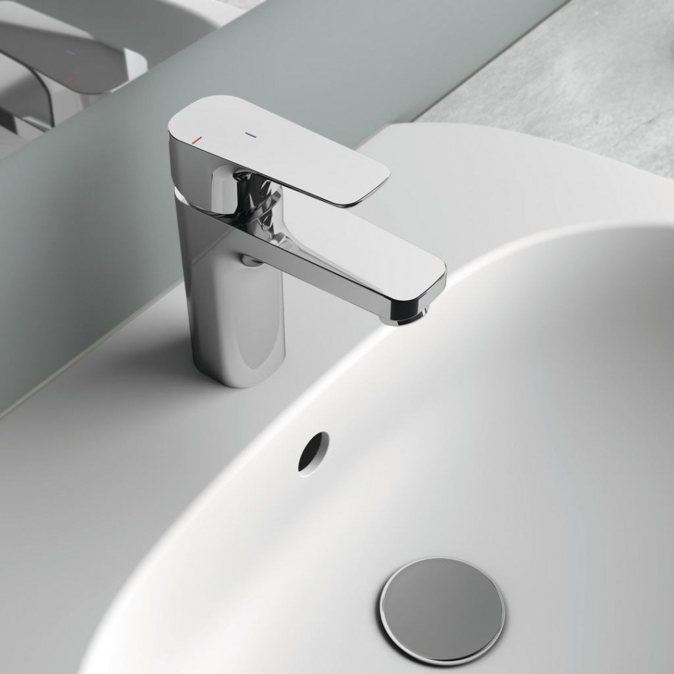 CERAPLAN III SLIM Grande Однорукоятковый смеситель для умывальника без донного клапана, технология Blue start®, система монтажа EASY-FIX (облегченный монтаж), гибкая подводка G3/8" (шланги PEX), керамический картридж FirmaFlow 38 мм с функцией HWTC (ограничение максимальной температуры горячей воды), металлическая рукоятка с индикаторами горячей / холодной воды (Blue start® - индикатор холодной воды расположен по центру), аэратор Perlator, ограничение потока 5 л/мин
