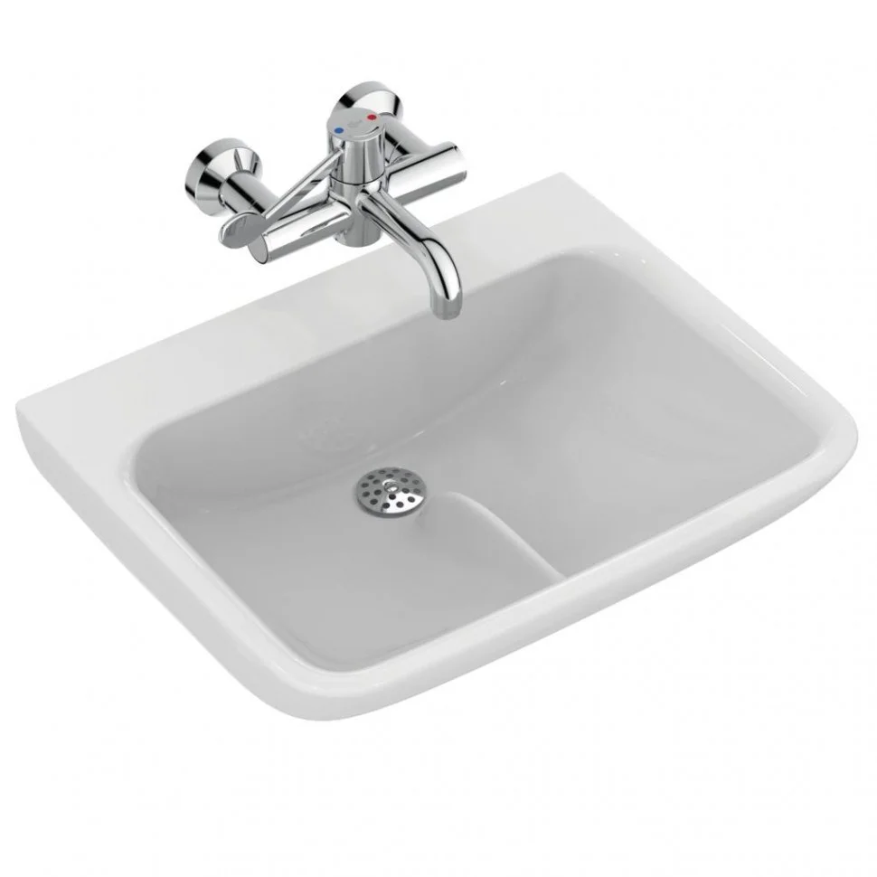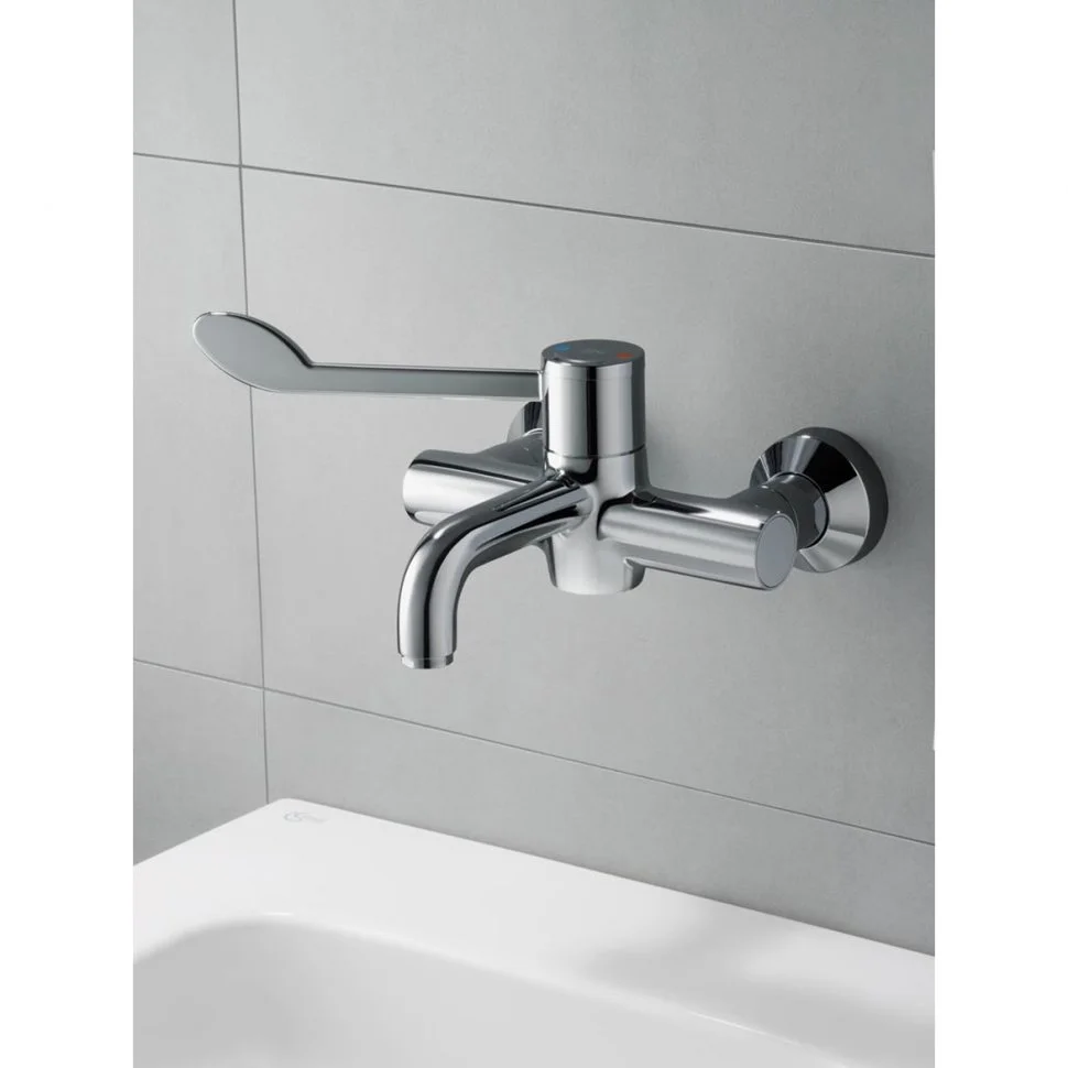 CERAPLUS 2.0 Настенный смеситель для умывальника с цикловым затвором, латунный корпус, технология Ni-free (без никеля), термостатический цикловой картридж с возможностью термической дезинфекции, винт ограничения максимальной температуры, съемные скрытые эксцентрики с термической изоляцией, ламинарный регулятор потока (защита от попадания бактерий) (ключ в комплекте), металлическая цикловая рукоятка 200 мм с нестираемыми индикаторами горячей/холодной воды, класс шумности 1