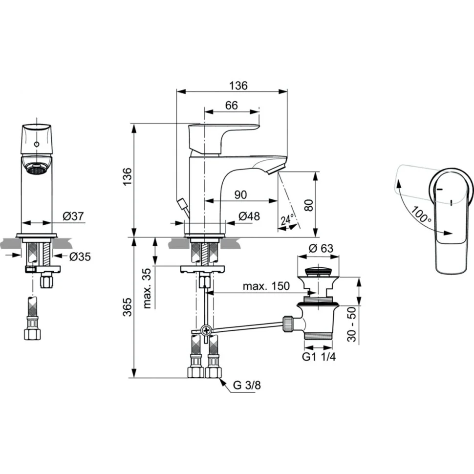 CONNECT AIR Piccolo Смеситель для умывальника, тонкий корпус 36 мм, технология Blue Start, система монтажа EASY-FIX (облегченный монтаж), аэратор Perlator M24x1 с ограничением потока 5 л/мин., керамический картридж 25 мм без функции HWTC, без функции CLICK, гибкая подводка PEX G3/8" 400 мм, металлический донный клапан