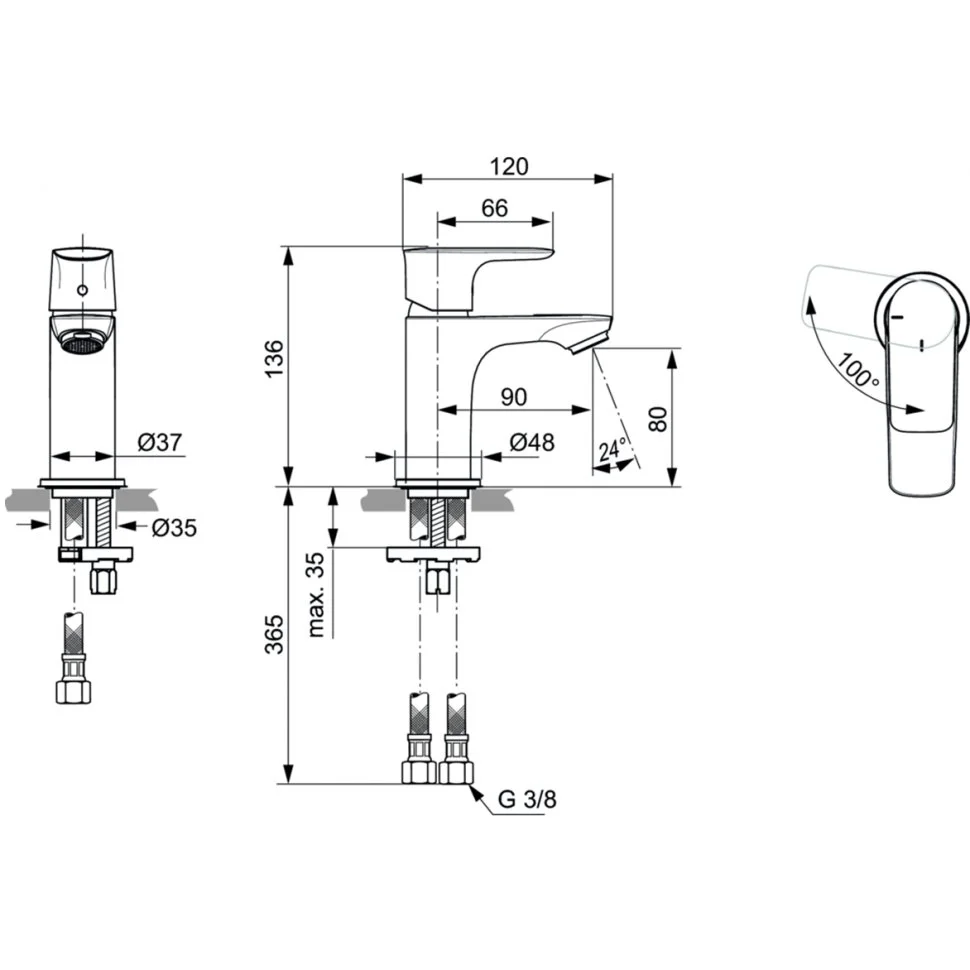 CONNECT AIR Piccolo Смеситель для умывальника, тонкий корпус 36 мм, технология Blue Start, система монтажа EASY-FIX (облегченный монтаж), аэратор Perlator M24x1 с ограничением потока 5 л/мин., керамический картридж 25 мм без функции HWTC, без функции CLICK, гибкая подводка PEX G3/8" 400 мм, без донного клапана