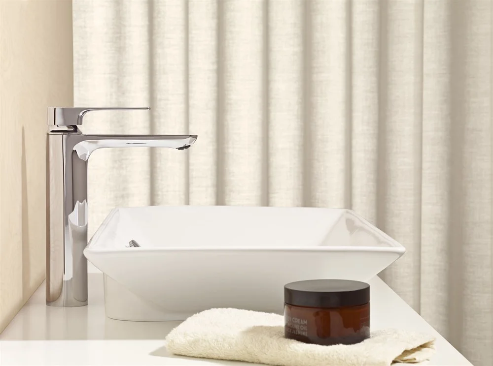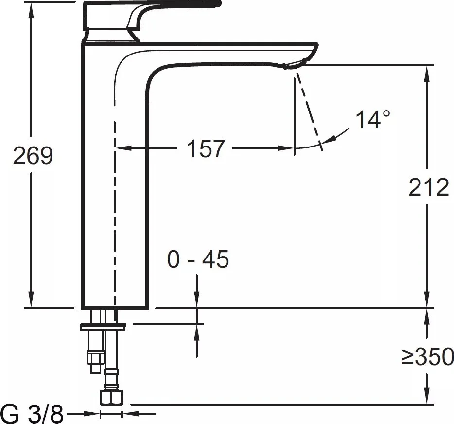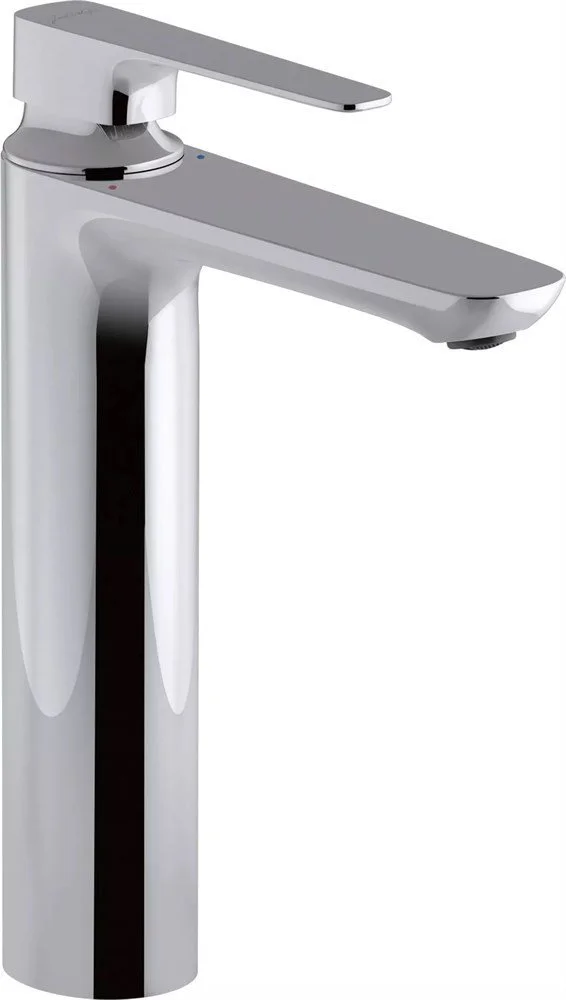 Высокий однорычажный смеситель для раковины с гибкой подводкой без донного клапана.