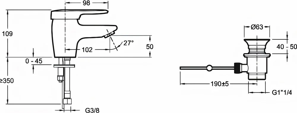 Высота 109 мм, длина излива 102 мм.