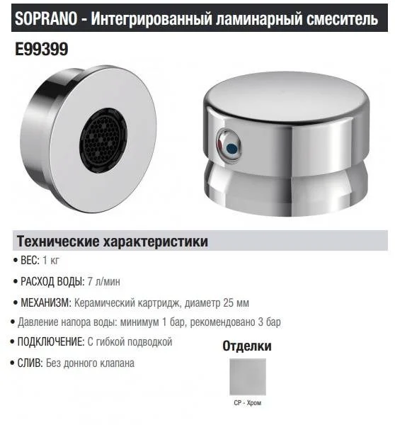 Soprano, интегрированный ламинарный смеситель для умывальника, арт. E99399-CP, Jacob Delafon, Франция