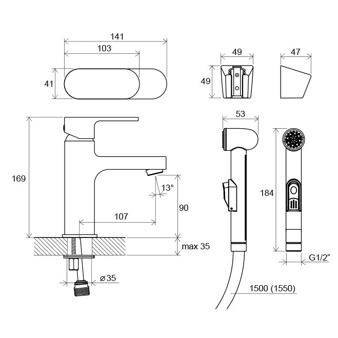 исполнение: с ручным гигиеническим душем и настенным держателем