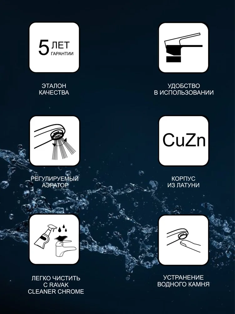 Изделие содержит скрытый аэратор, который легко достается с помощью монеты. Для целостного решения и согласованного дизайна ванной комнаты рекомендуем смесители Classic комбинировать с остальными изделиями концепции Classic и другими аксессуарами RAVAK. Для очистки внешней поверхности рекомендуем использовать средство RAVAK Cleaner Chrome.