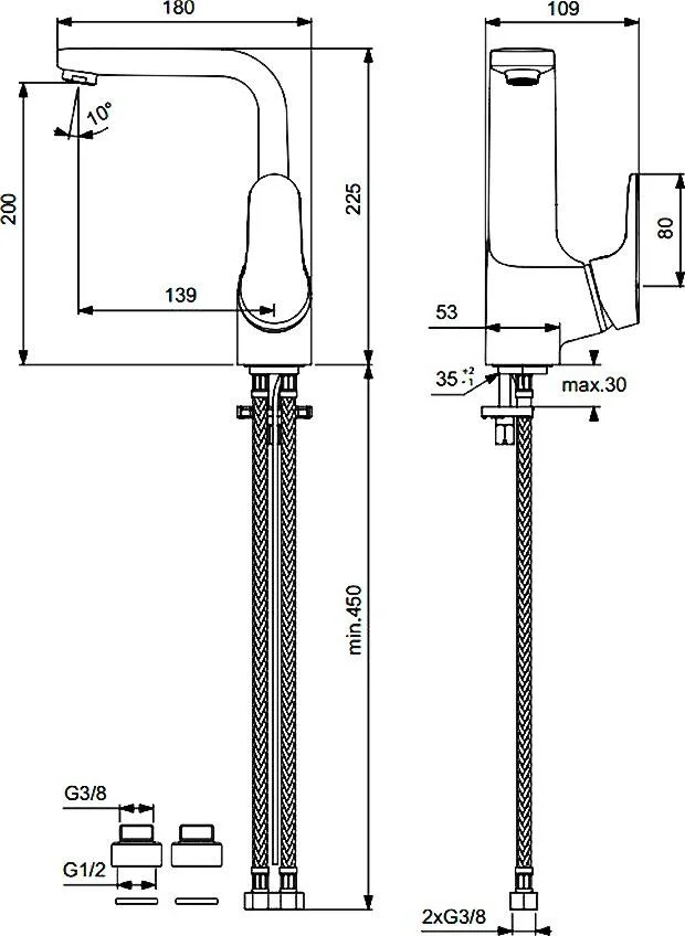 - Подводка: гибкая 3/8" (переходник на 1/2" в комплекте), длина 450 мм