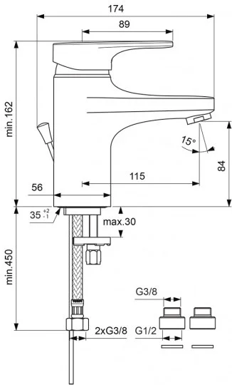 - Подводка гибкая 3/8" (переходник на 1/2" в комплекте), длина 450 мм